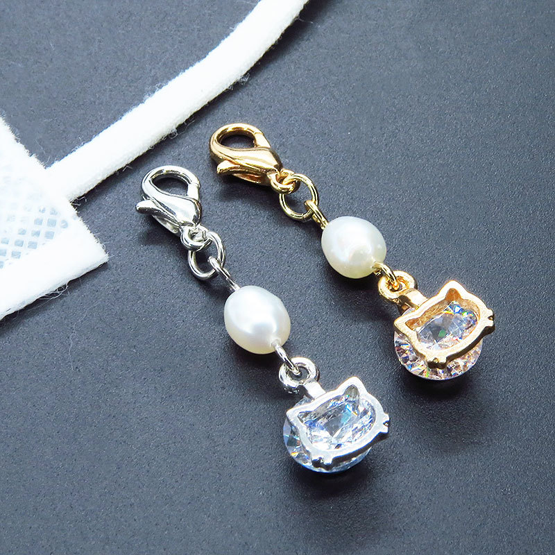 マスクチャーム ゴールドカラーの猫フェイスフレームのキュービックジルコニアと淡水パールの大人可愛いチャーム