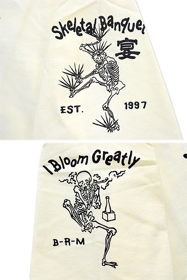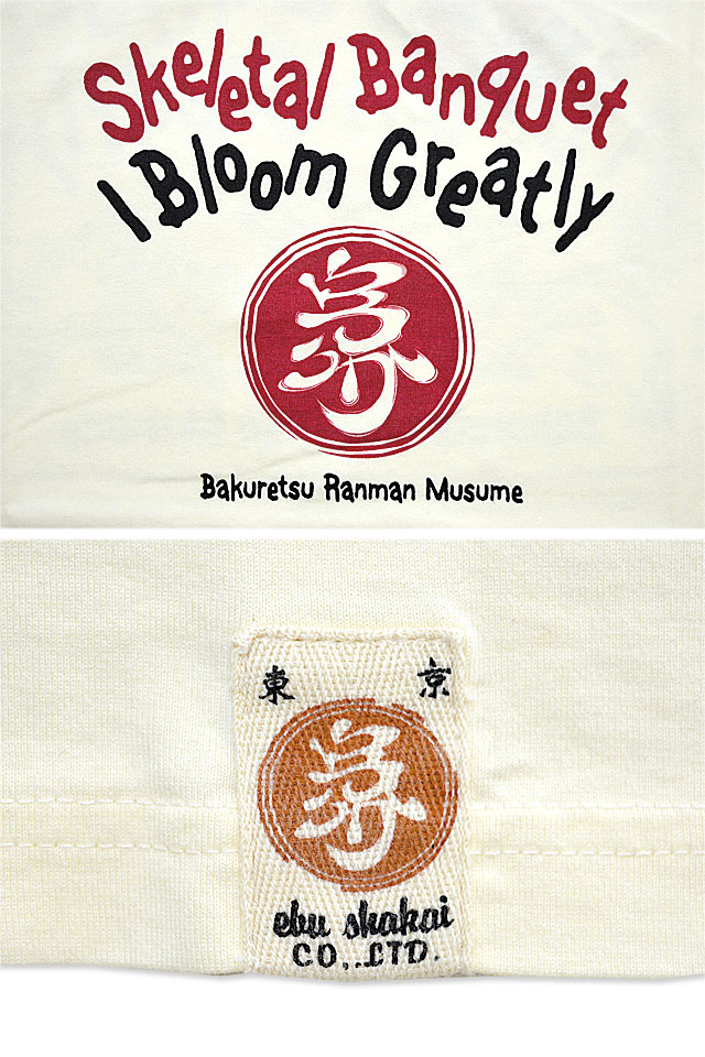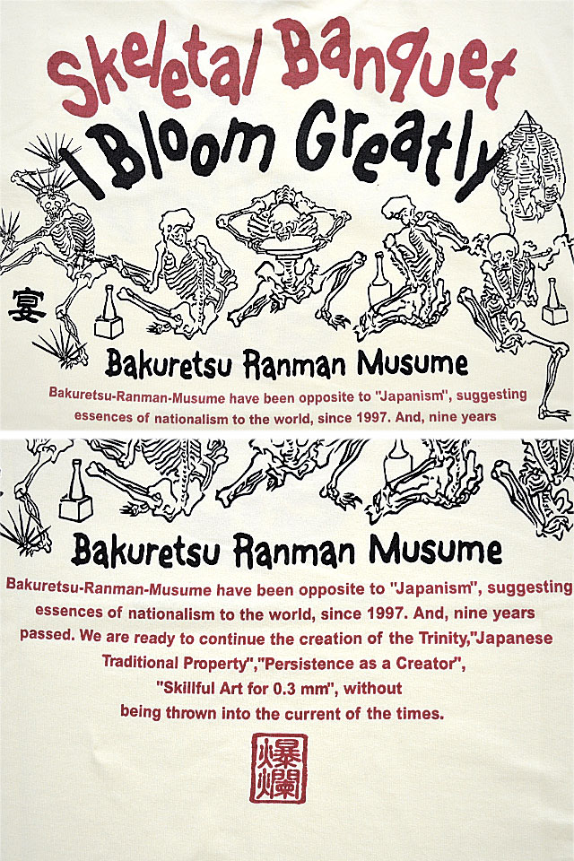 爆烈爛漫娘さんから「ドクロ宴半袖Tシャツ(RMT-303)」のご紹介です。 骸骨たちが宴会を楽しんでいる様子を、爆烈爛漫娘風にコミカルに描いたグラフィックデザイン! 背中には、宴を楽しむ骸骨達を大胆にプリント。 バックにしっかり柄を入れている分、フロントはシンプルにデザイン。 生地には、爆烈爛漫娘お馴染のよれにくくタフなボディーを採用しました。  | ||||||||||||||||||||||||||||||