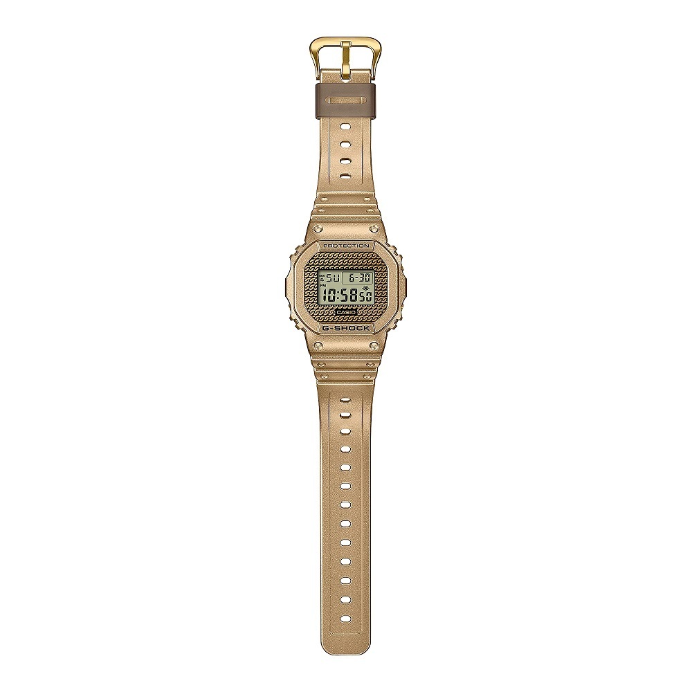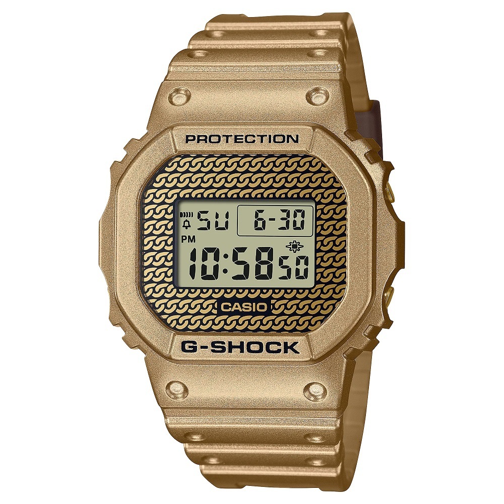 1983年の発売以来、飽くなき強さを求めて進化を続けるタフネスウオッチG-SHOCK。Hip HopカルチャーのゴールドアクセサリーやチェーンからインスパイアされたDWE-5600HGです。人気のゴールドとブラックのカラーリングをベースに、文字板にはチェーンの模様をあしらい、Hip Hopスタイルをイメージしたクールなデザインとなっております。ベースモデルには、バンドとベゼルが付け替え可能になったDWE-5600を採用し、ブラックとスケルトンをベースにした交換用のバンドとベゼルを2セット同梱しました。その日の気分やファッションに合わせて付け替えることが可能なG-SHOCKです。