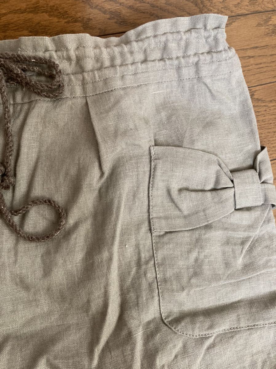 ウエスト紐なので、楽チンです。ポケットのリボンがかわいいです。