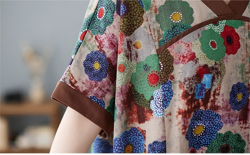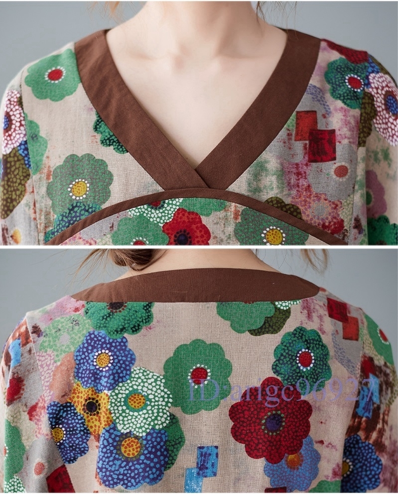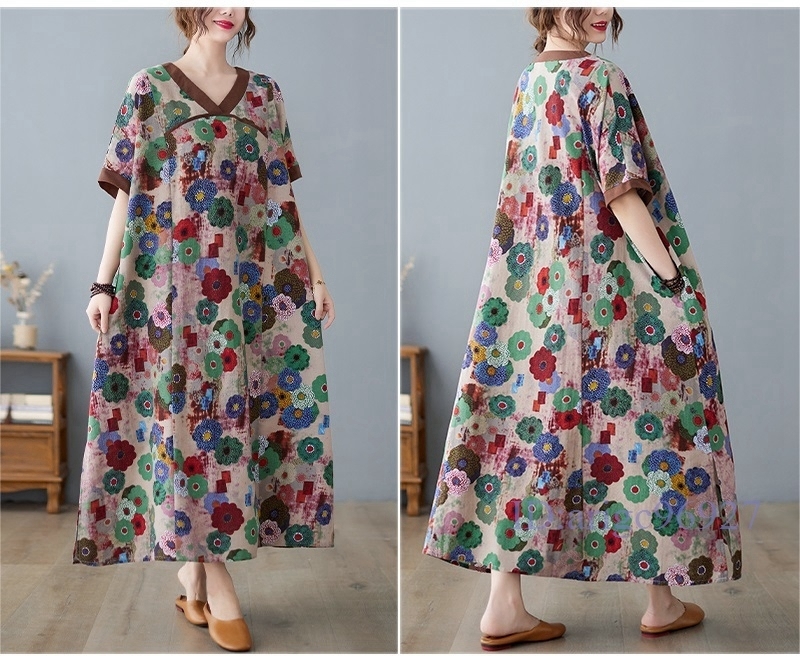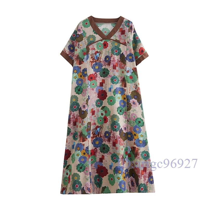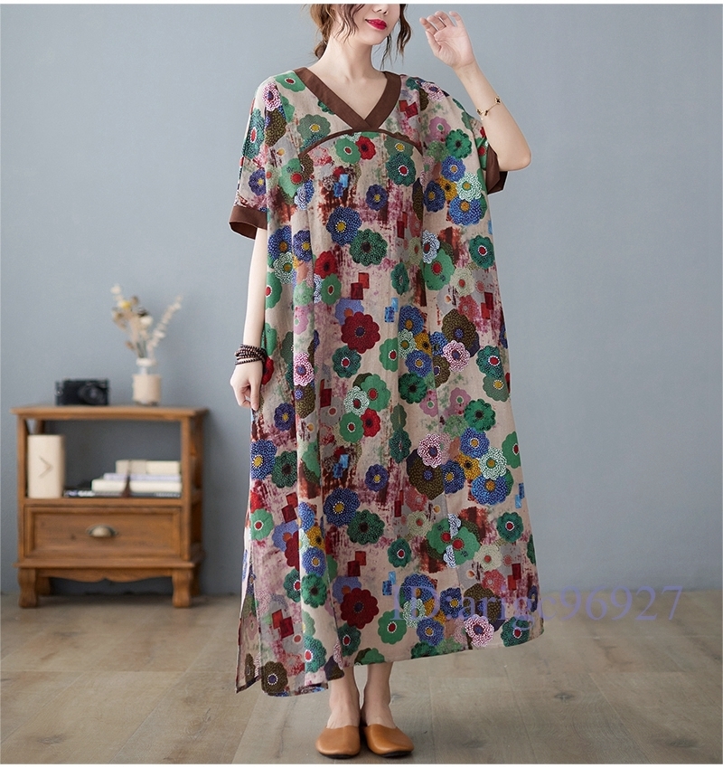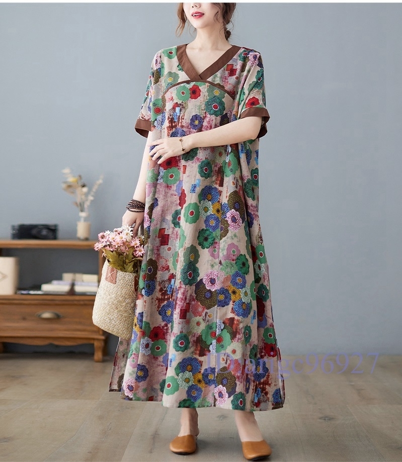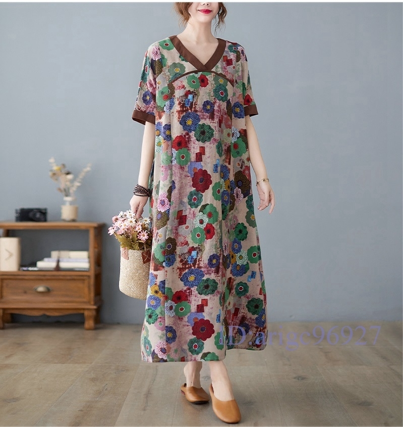 N328★新品夏**レディース*カジュアル*ゆったり大きいサイズ体型カバー*総柄花柄*Vネック半袖マキシロングワンピース*
