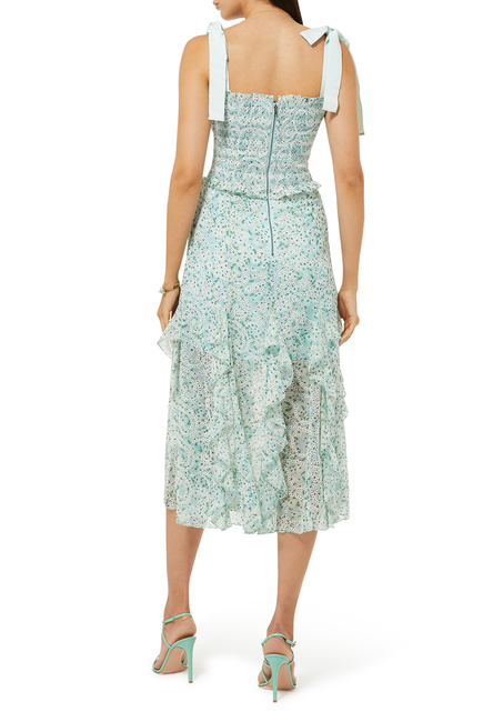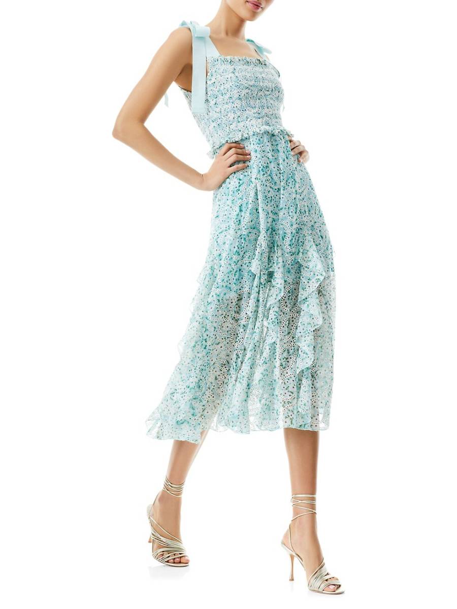 Alice+Olivia アリス・アンド・オリビアワンピース Jocelyn Smocked Midi Dress with Bow Strapsです。