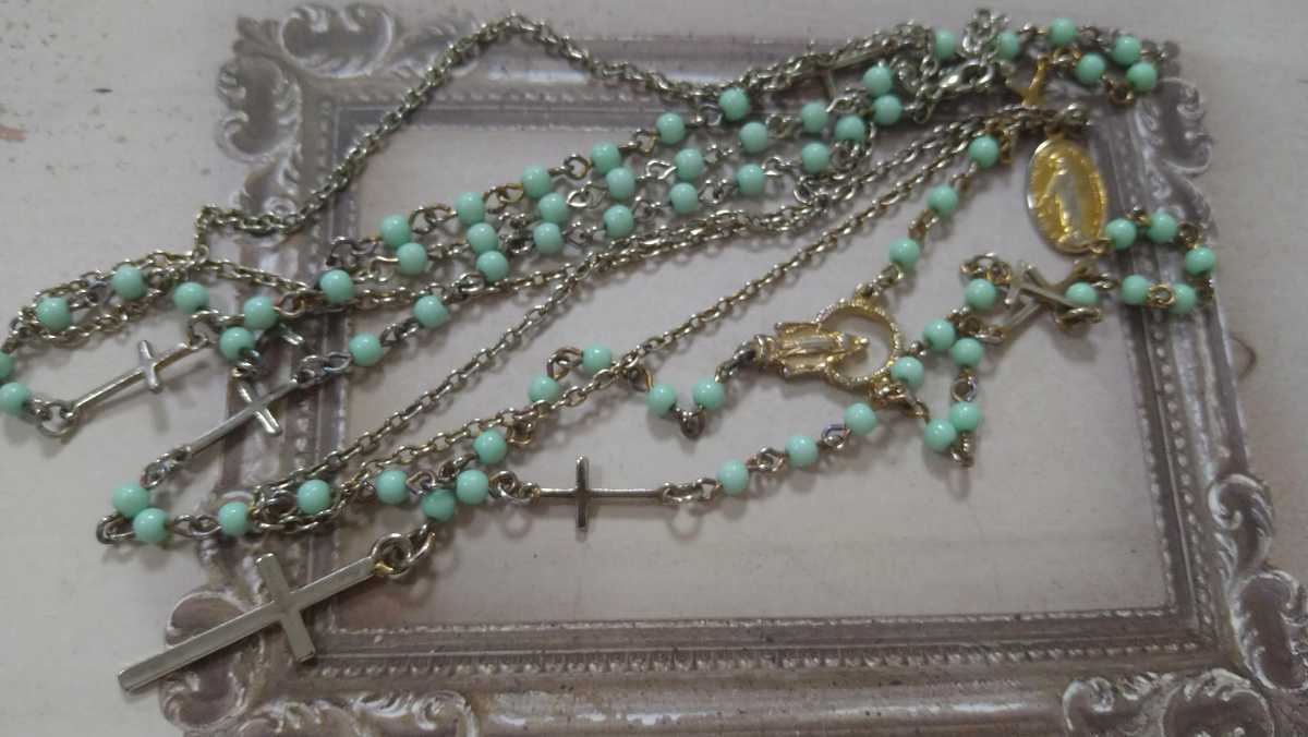 ミントグリーン×シルバーカラーチェーンのロザリオ風ネックレスです