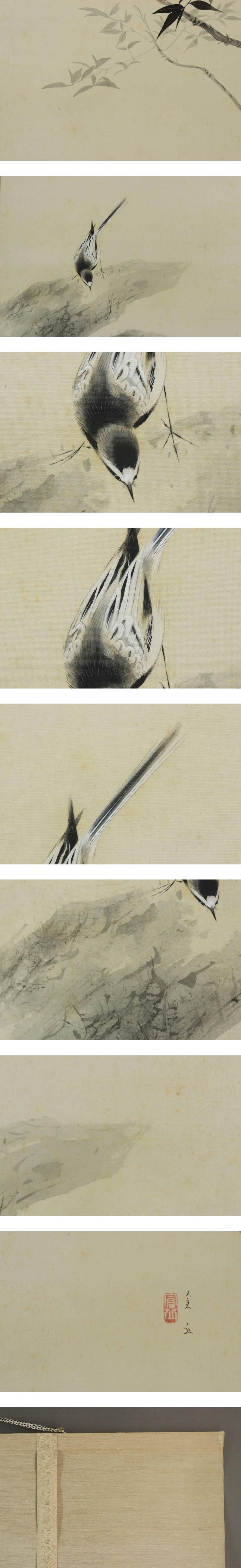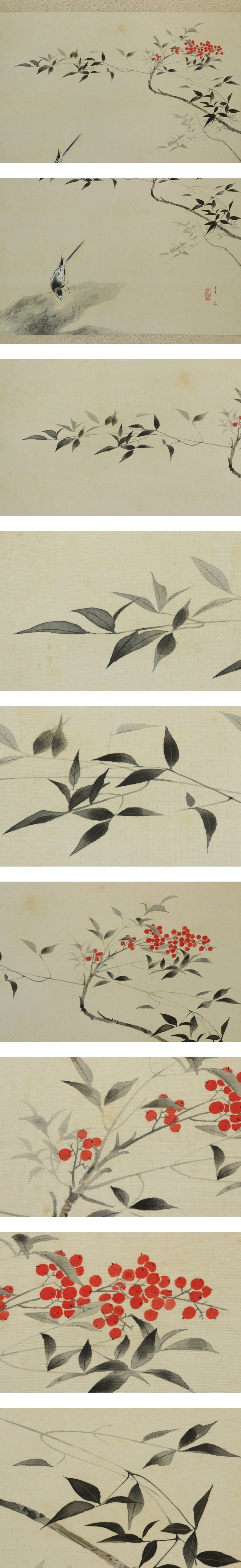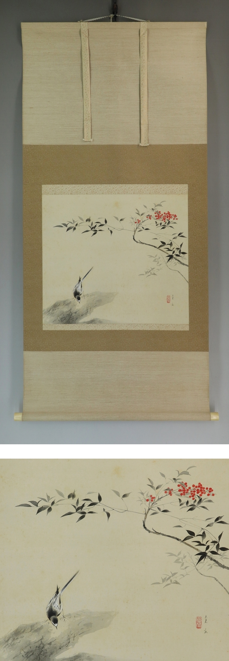 | №2205207【真作】山本倉丘【南天鶺鴒之図】◆絹本◆共箱◆二重箱◆掛軸 | |