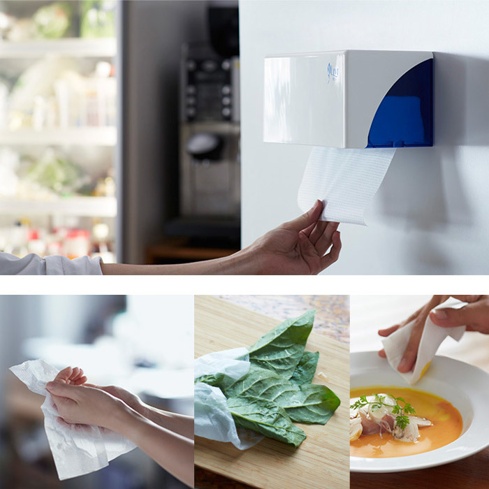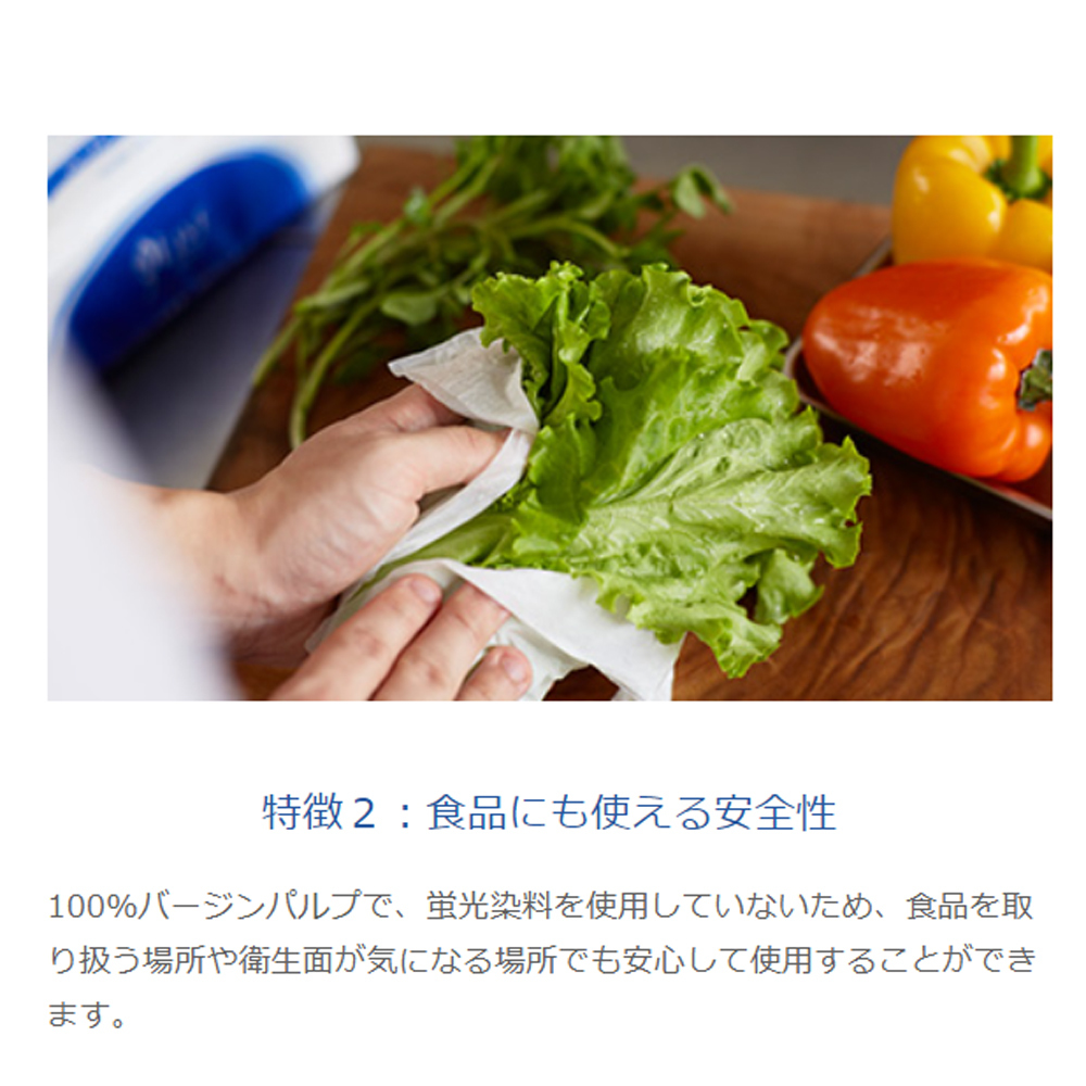 100%バージンパルプを使用しているペーパータオルは、柔らかさと丈夫さを兼ね備えた紙質で、その拭き心地も抜群。表面にエンボス加工を施し、吸水性にもこだわっています。