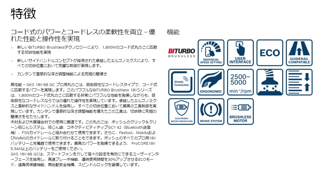 ボッシュ BOSCHコードレス丸のこ BITURBO GKS18V-68GCH※バッテリ・充電器は別販売品です。■特長・新しいBITURBO Brushlessテクノロジーにより、1,800Wのコード式丸のこに匹敵する切断性能を実現・新しいサイドハンドルコンセプトが採用された卓越したエルゴノミクスにより、すべての切断位置において完璧な制御が実現します。・カンタンで直感的な深さ調整機能による究極の簡便さ