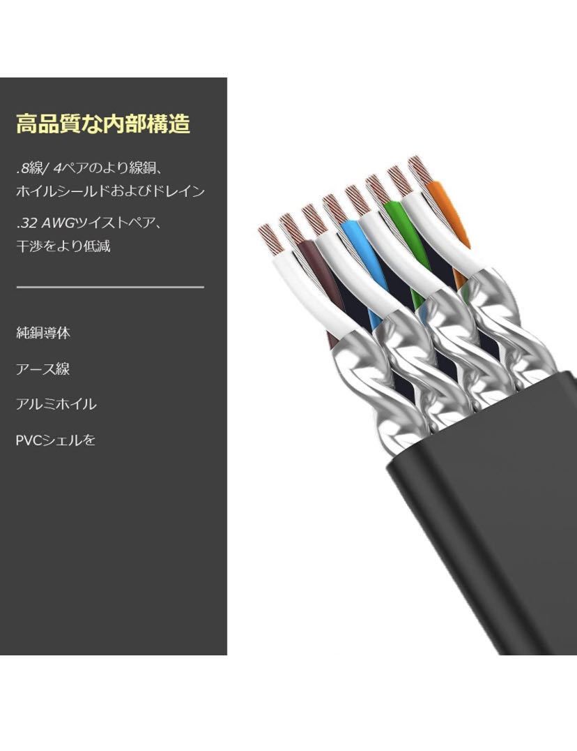 【高品質】当社のCat 7パッチワイヤーは、4ペアの32AWGツイストペア銅線で作り上げて、更に、RJ45コネクターは50ミクロン金にメッキされたシールドを付き、さらに、環境に優しく耐摩耗性が抜群なPVCシェルを採用し、耐久性に優れています。また、 Cat 6イーサネットケーブルに比べて、クロストーク、ノイズからの保護も強化します