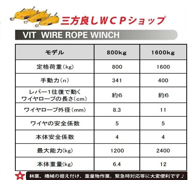 ●使用用途は林業、機械の据え付け、重量物作業、緊急時対応等