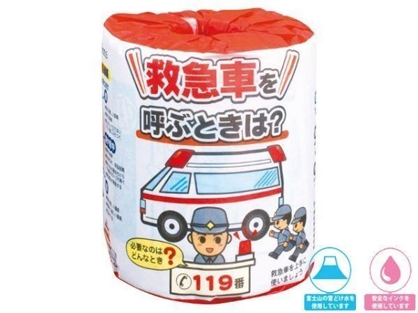 ★【販促用】【贈答用】【イベント】【積み上げ景品】に最適です★ ●救急車を呼ぶべきか迷った時に役立つ知識がプリントされています ●イベント等の啓発促進用にいかがですか? ●再生紙100%で環境に優しいダブルタイプのトイレットペーパー ◆安心の日本製【林製紙】の製品です◆ 【商品詳細】 ロールサイズ: 114mm×30m ダブル(2枚重ね) ケース入数: 100個 ミシン目: 有り 色・表面: 白・ソフト エンボス加工 絵柄: 救急車の利用方法のプリント 香り: 無し 紙の材質: 再生紙100% ケースサイズ: 515×515×485mm 梱包方法: 紙巻1ロール 重量(1ケース): 約13kg 用途: 贈答用、販促用、イベント用 製品名 救急車を呼ぶときは1R 型番 2905 メーカー 林製紙株式会社 |