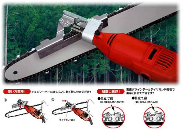 チェンソー刃が速く、簡単に、正確に、目立て(再研磨)できます。