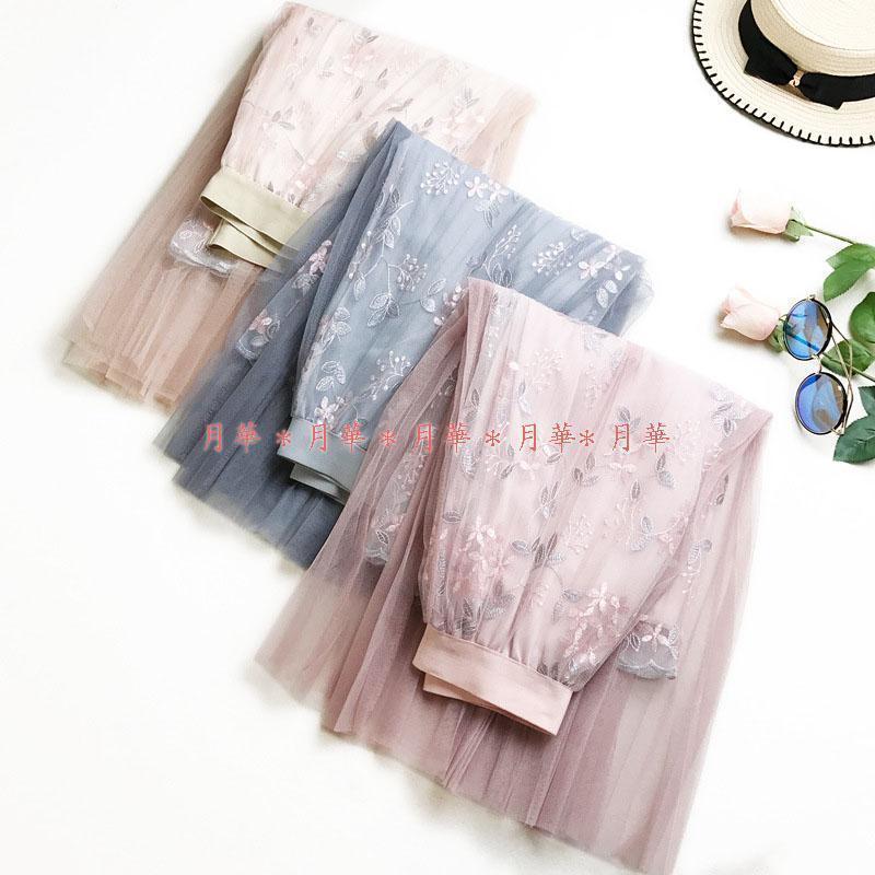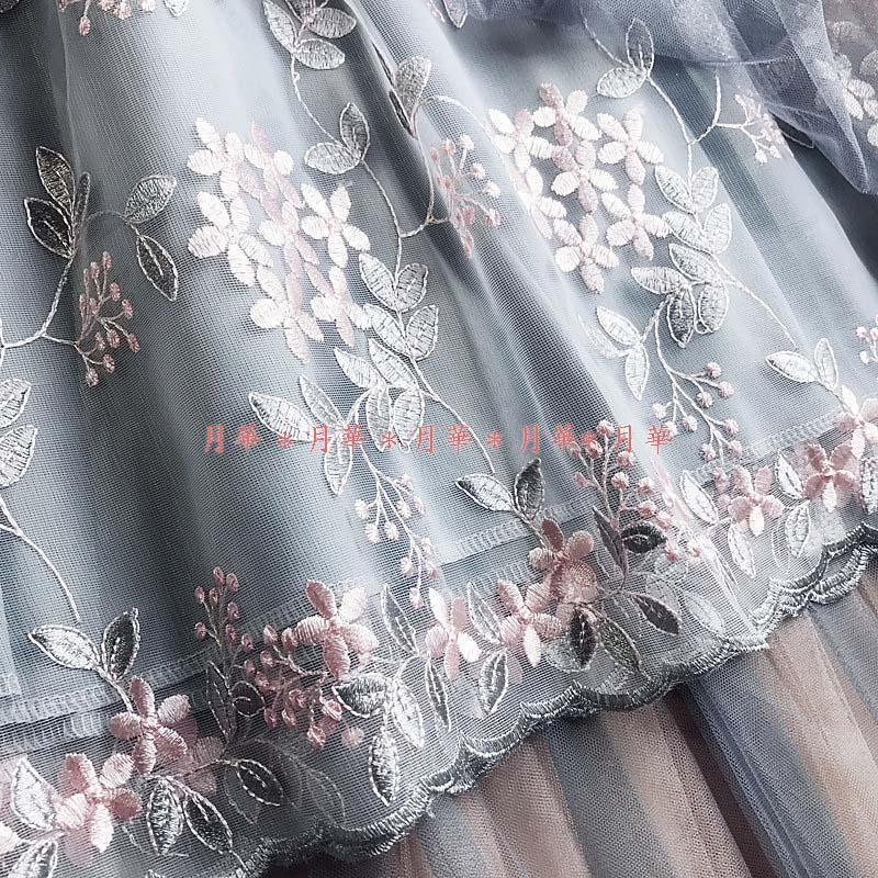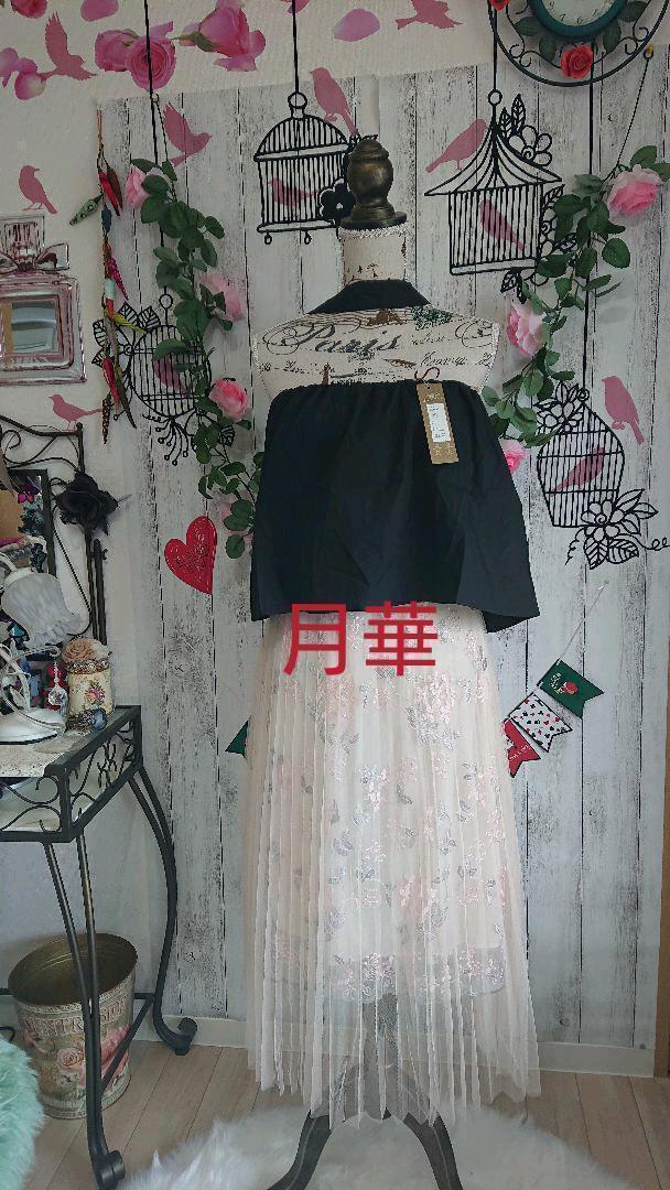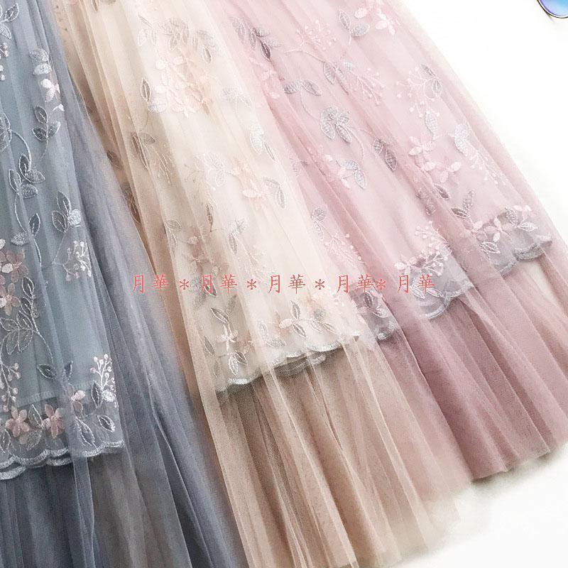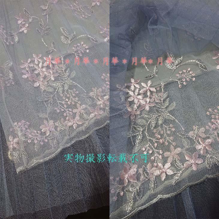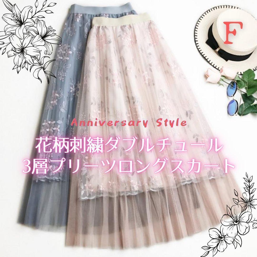 無地裏地・メッシュ花柄刺繍・プリーツチュールの3層仕立てスカート。
