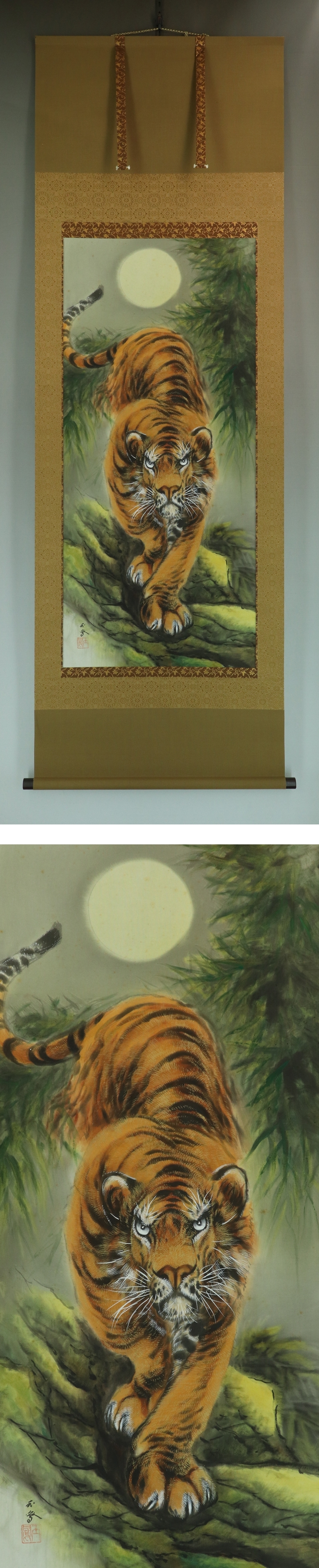 | №2210202【真作】堀江玉鳳【猛乕】◆絹本◆共箱◆太巻掛軸 | |