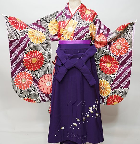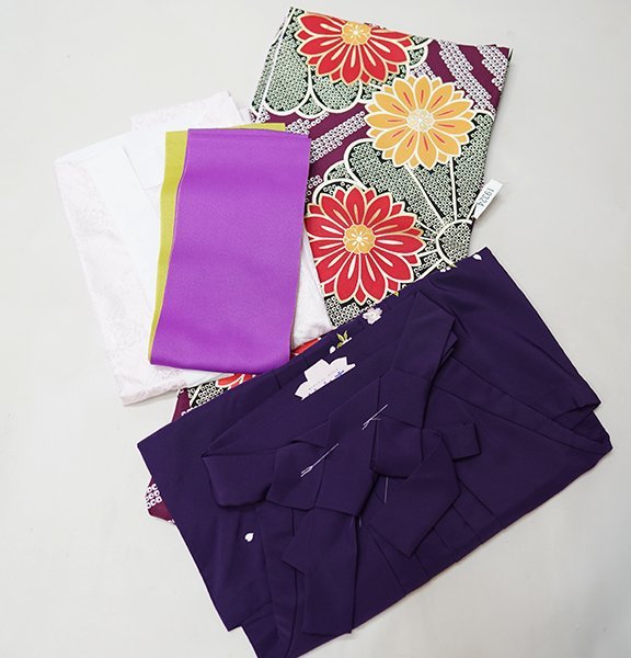項目 | 着物袴フルセット (適合身長:約135cm~143cm、約144cm~150cm ジュニア用へお仕立て直し致します。) ・二尺袖着物 ・二尺袖長襦袢(半襟付き) ・袴 ・袴下帯(浴衣帯にも使用できます。) |
