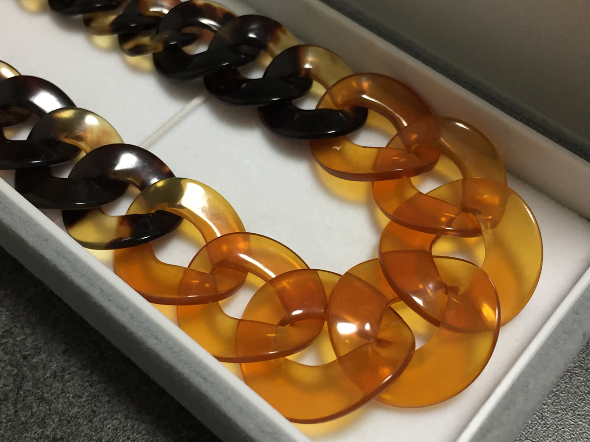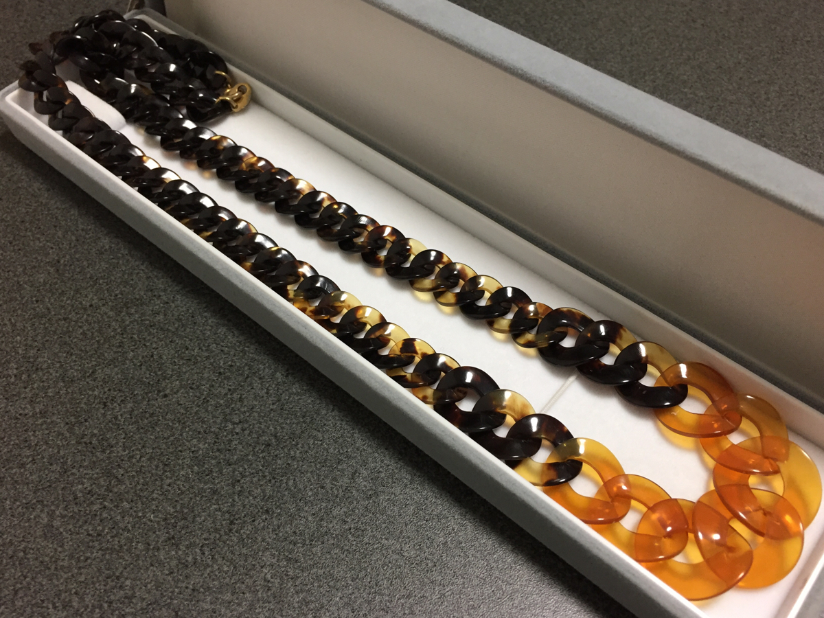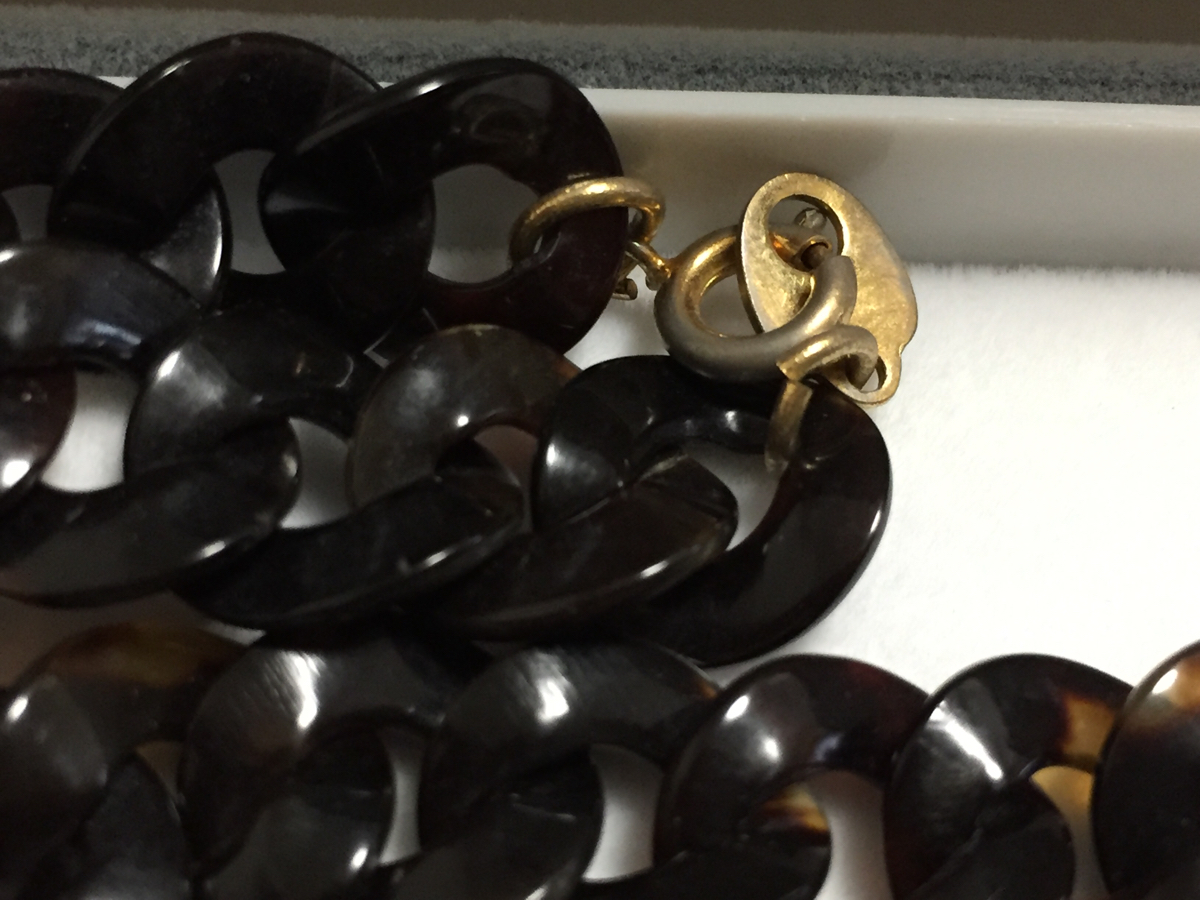 アンティークの白甲・黒甲の本鼈甲を使用した、グラデーションデザインのロングネックレスです。鼈甲部分に欠けや虫喰いはありません。金具部分に劣化があります。 長さ60.5cm、重さ16.5g 最大パーツ 縦1.8cm、横2.0cm