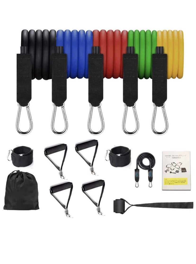 【ハンドルやドアアンカーなど色々補助具付き】トレーニングチューブ5本、ハンドル2個、足首ストラップ1個、ドアアンカー1個、収納ポーチ1個で合計10点セットが入ります。これ1セットで家族全員でトレーニングをお楽しみ頂けます。