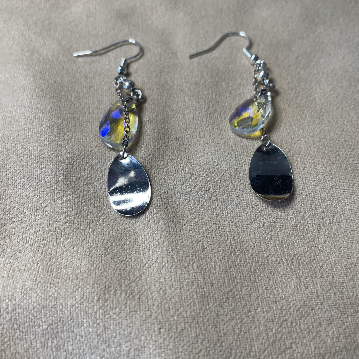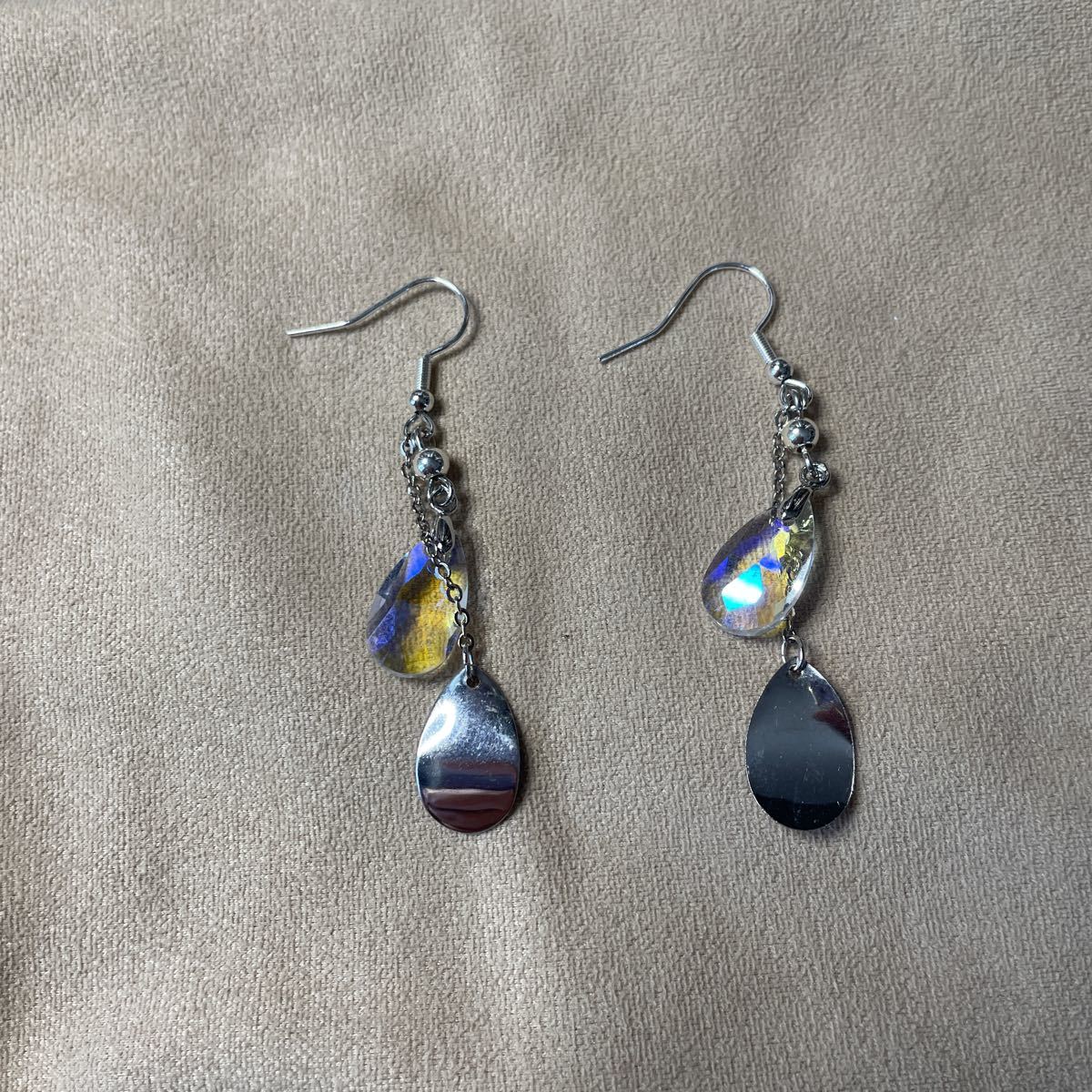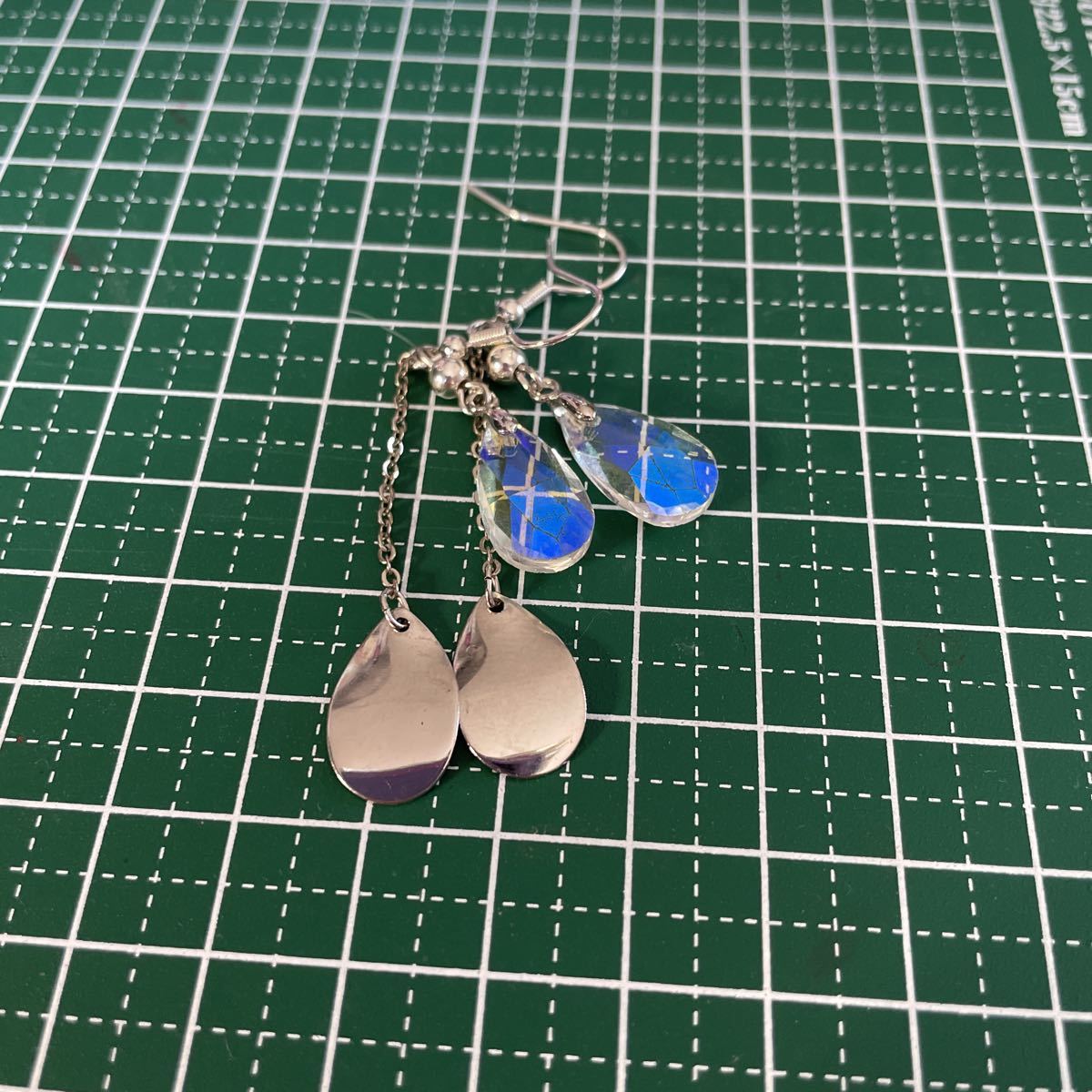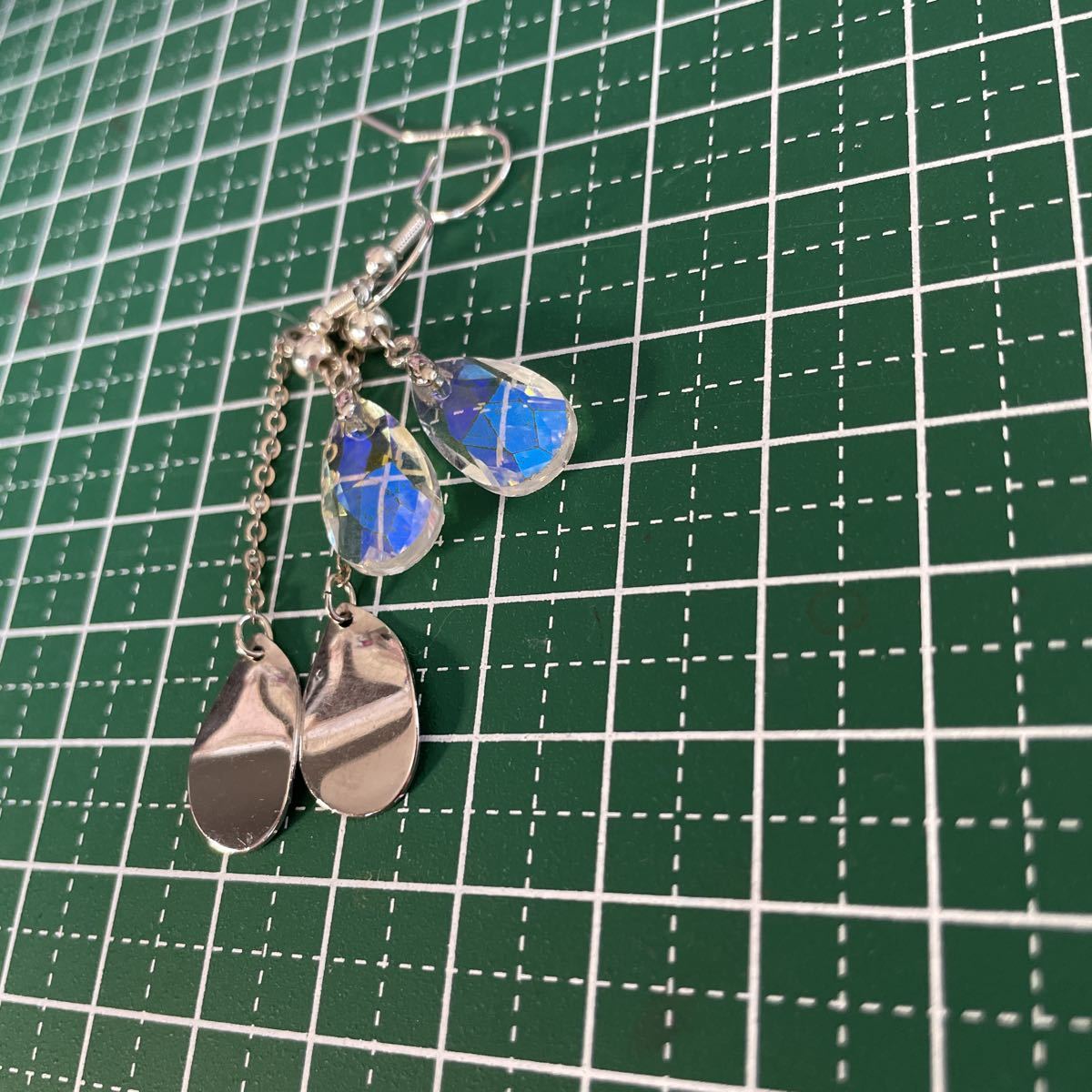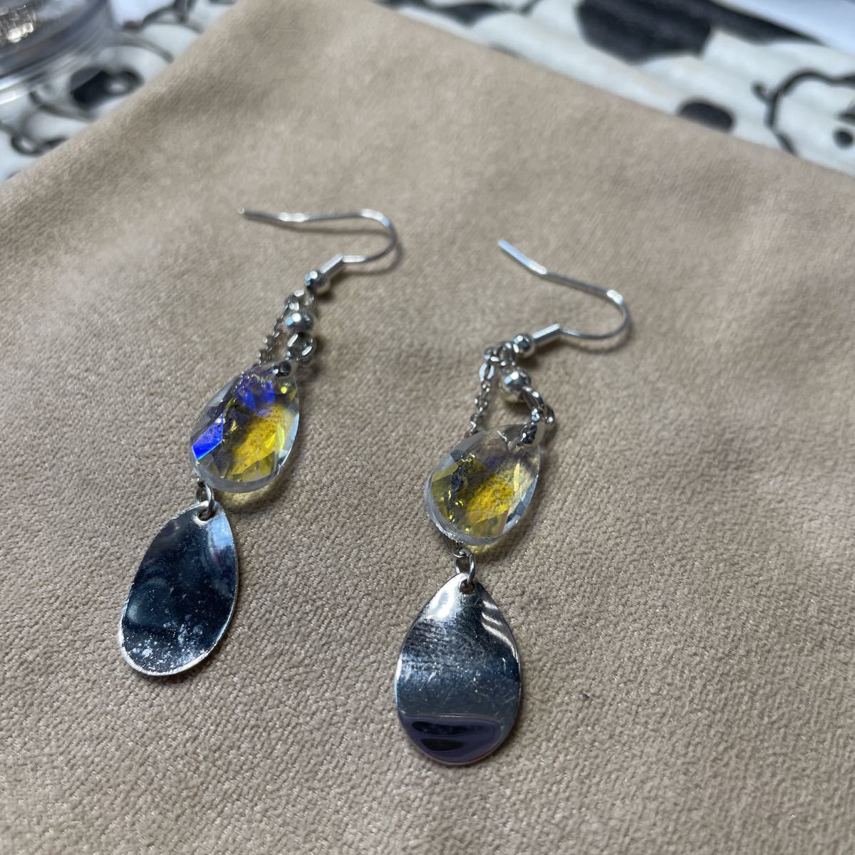 キラキラガラスとチェーンにぶら下げたシルバーカラーパーツを合わせました。フックはステンレスにプラチナメッキしたものを使用しております。