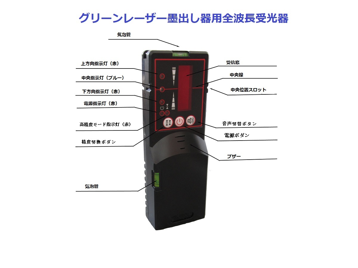 グリーンレーザー墨出し器 全波長受光器 屋内屋外兼用受光 50m光線対応 ブザー音 気泡管 ホルダー付き