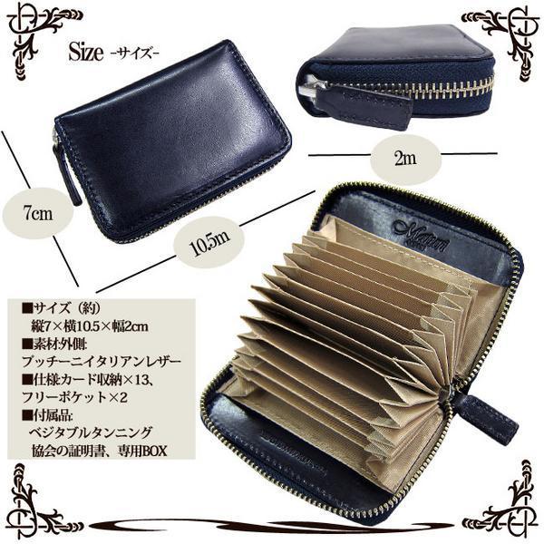 扇のように大きく開き、必要なカードをひと目で見つかると同時に指も入るので取り出しやすさ抜群です。 フリーポケットを含め、合計15ヶ所に収納可能。 ポイントカードや診察券でいっぱいの財布をすっきりしてくれる、便利なアイテム。 高い生産基準を満たした「イタリア・ベジタブルタンニング協会」認定の高品質イタリアンレザーを大胆に使用し、 飽きの来ないシンプルかつスタイリッシュなデザインに仕上げました。 カラー・仕様共に、年齢問わずご愛用いただけるカードケースです。 ■カラー:ネイビー ■サイズ(約):縦7×横10.5×幅2cm ■素材:外側/プッチーニイタリアンレザー、内側/ナイロン ■仕様:カード収納×13、フリーポケット×2 ■付属品:ベジタブルタンニング協会の証明書、専用BOX 【ベジタブルタンニング協会の証明書とは】 イタリアの伝統的な革なめし業に従事するタンナーが所属する組合。 小さな血筋、しわ些細な傷は天然素材の証明でありそれぞれの革をこの世で唯一のものにしています。 メンバーが供給するレザーには環境への配慮、皮革の自然さ、鞣し行程の高い生産基準などの条件を満たした、 高品質なイタリアでなめされたベジタブルタンニングレザーであるという証の証明書が付きます。 また、証明書にはシリアルナンバーが一枚一枚印刷されており、偽造出来ない唯一無二のものです。 【訳あり商品】 こちらは新品・未使用ですが、製造過程による細かい傷、ノリ汚れ、擦れ等がございます。 通常のご使用には問題ございませんが、神経質な方は入札をお控え下さい。 ※こちらの商品は全てにおいてノークレーム・ノーリターンです。 ご了承の上、入札下さいませ。 --革製品について-- ・製作過程により多少の傷、汚れ、縫い目が粗い、塗装にムラ、接着剤跡等がある場合が御座います。 ・天然素材の商品は、自然由来の素材のため革には細かなシワや傷跡・トラ等が存在する場合があります。 ※シワなどは、動物の生育環境や年齢、個体によって異なる、革の特性です。 ・商品の仕様・デザインは、製品向上の為に予告なしに変更になる場合がございます。 ・掲載している写真は、ご使用のコンピュータの環境や撮影の光加減によって実際の商品のイメージと多少異なることが御座います。 これらについては予めご理解頂いた上でご購入お願いします。 | |