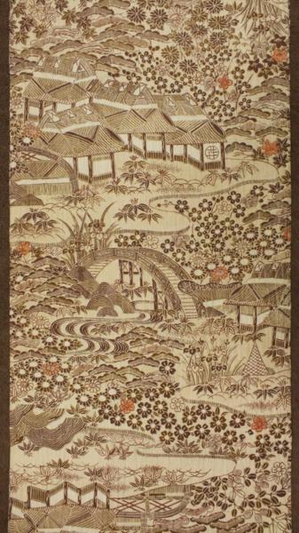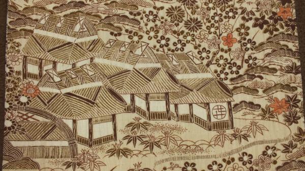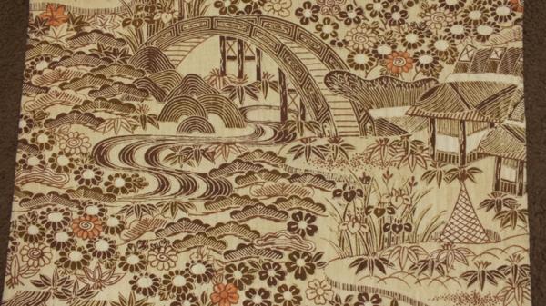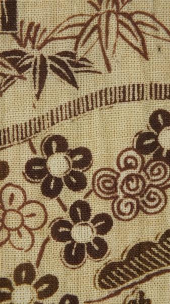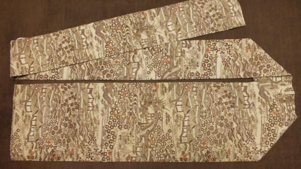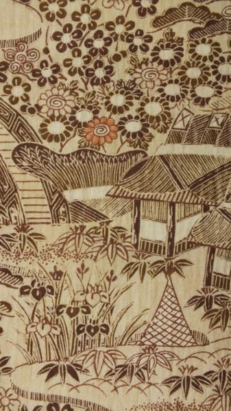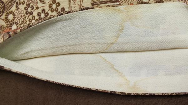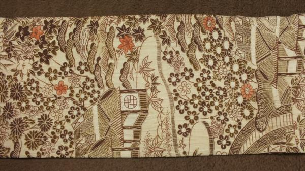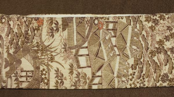 素材:綿。幅29.5cm、長さ339cm。写真ではわかりにくいですが、小干谷縮のようにしぼのある生地に染められております。お腹の柄辺りの内側にシミがあります。状態は写真をご参照頂けますようどうぞよろしくお願いいたします。【撮影時の照明の加減で実物の色よりも黄白く写っている場合があります。】