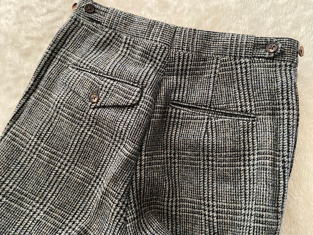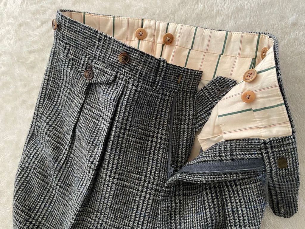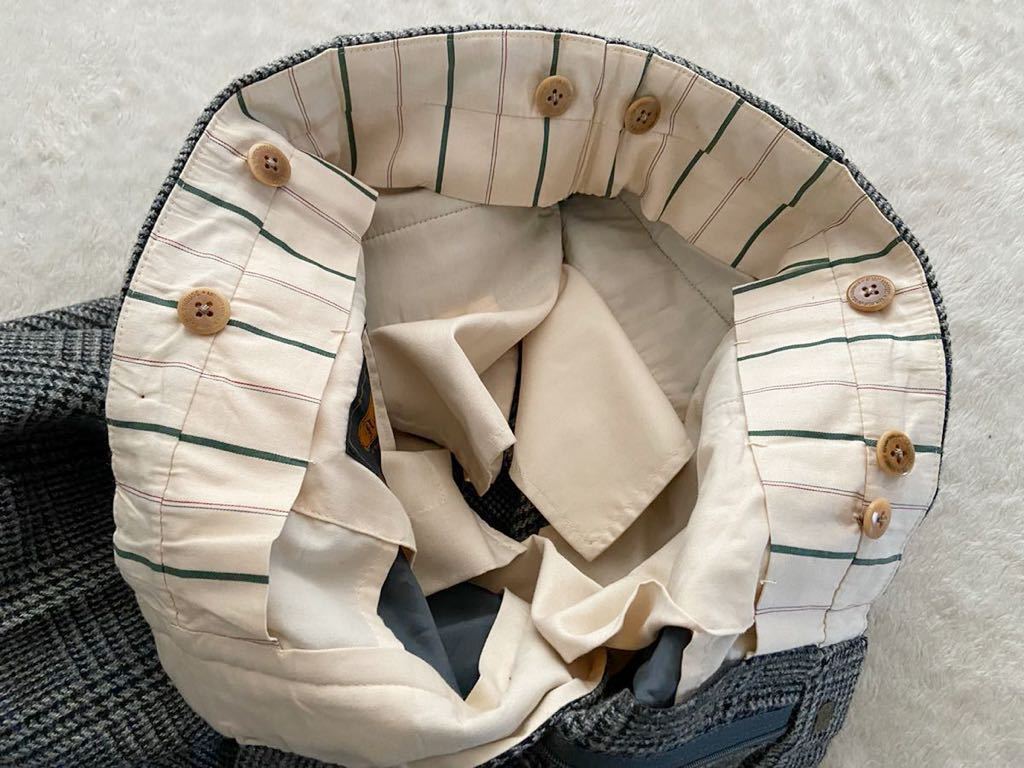 パンツはベルトレスでサイドのボタンベルトで調節して穿いて頂けますのでシャツやカットソーの裾をタックインしてウエスト周りをすっきりと着こなして頂いたり、内側にサスペンダーボタンついておりますのでお手持ちのサスペンダーを使ってクラシックに穿きこなして頂いたりしても雰囲気があってお洒落だと思います。