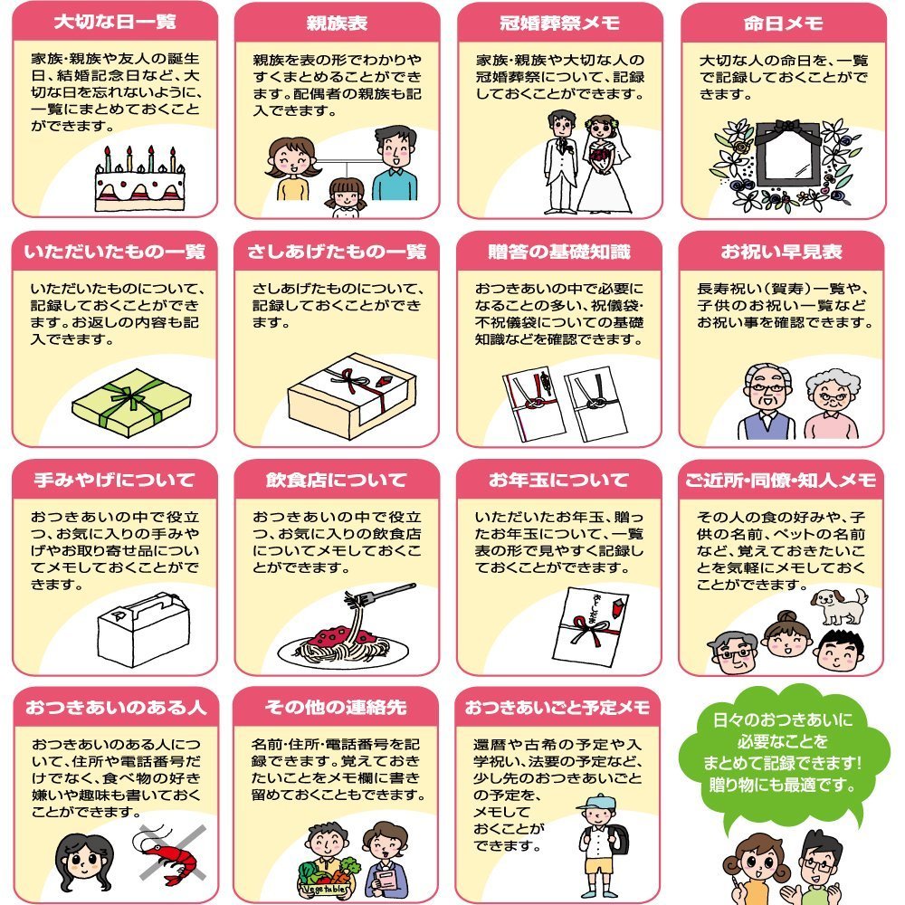 日々のおつきあいに役立つ情報を1冊にまとめることができます。必要な時にすぐに確認できますので、安心です。