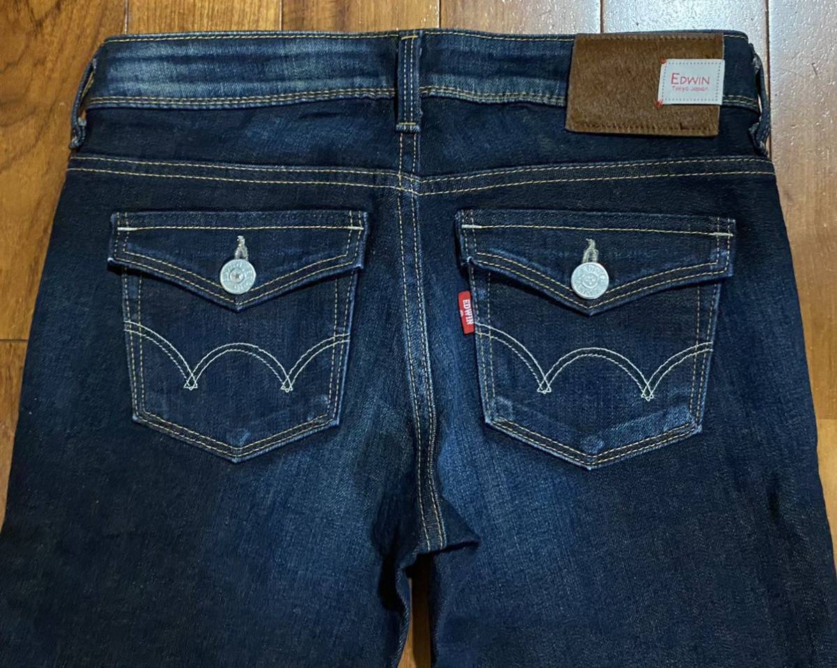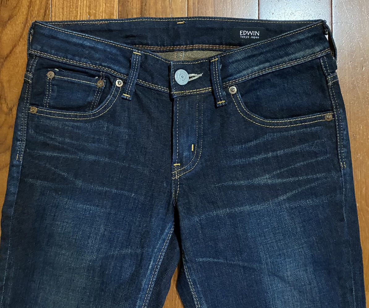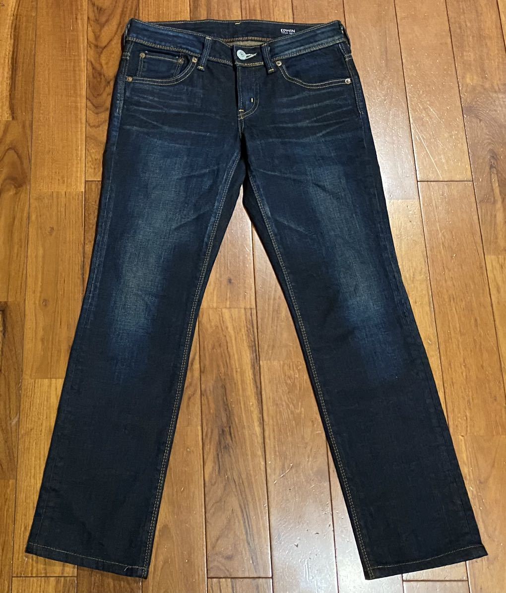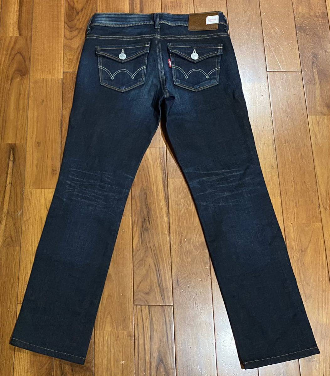 エドウィンのストレッチデニム(ジーンズ)、5572Lです。色はインディゴブルーです。USEDですが状態は良いです(10段階中8程度)。生地はストレッチ入りで綿95%、ポリウレタン5%です。ハラコ牛革パッチ、ジッパーフライです。正規品です((株)エドウイン商事、日本製)。サイズはW27でウエストは重ねずに平置きで約74cm、ヒップ約90cm、股上約20cm、股下約70cm、股下15cmのふともも部分約45cm、裾まわり約35cm、重量約480gです。発送はゆうパケットポストになります。