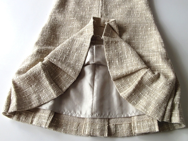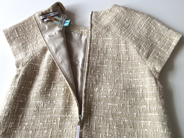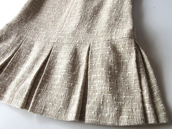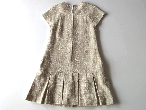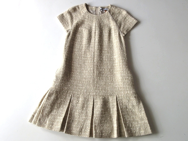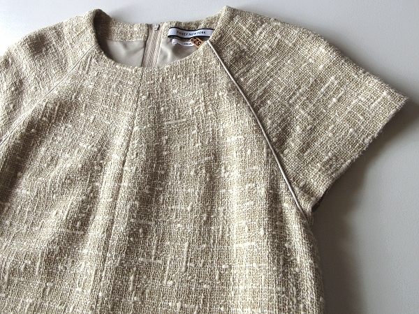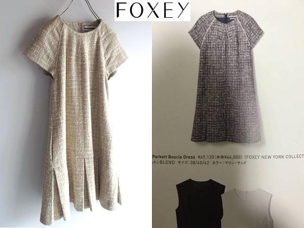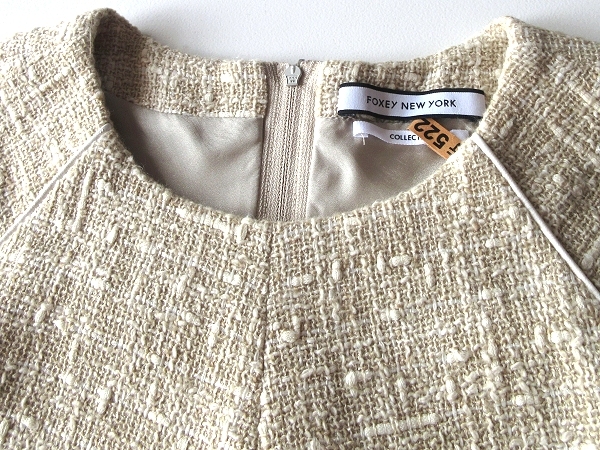 フォクシーニューヨークコレクション、2016年モデルのドレス。コットンメインのツイード生地を使用しております。フレンチスリーブのデザインに、スカート部分に入れたタックがポイント。バックジップのテープがさりげないアクセントになります。上質な素材使いと綺麗なシルエットで、様々なコーディネートにお使い頂ける一着です。
