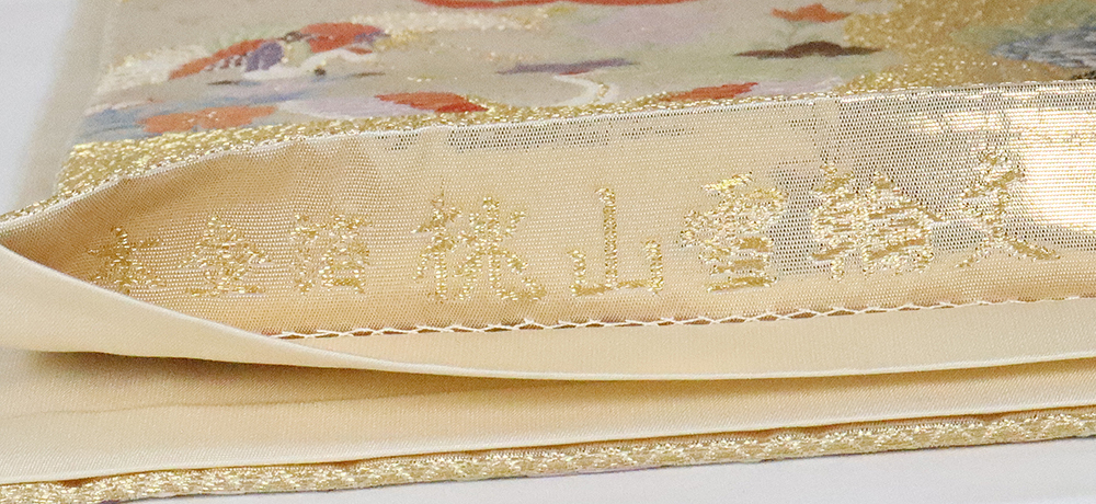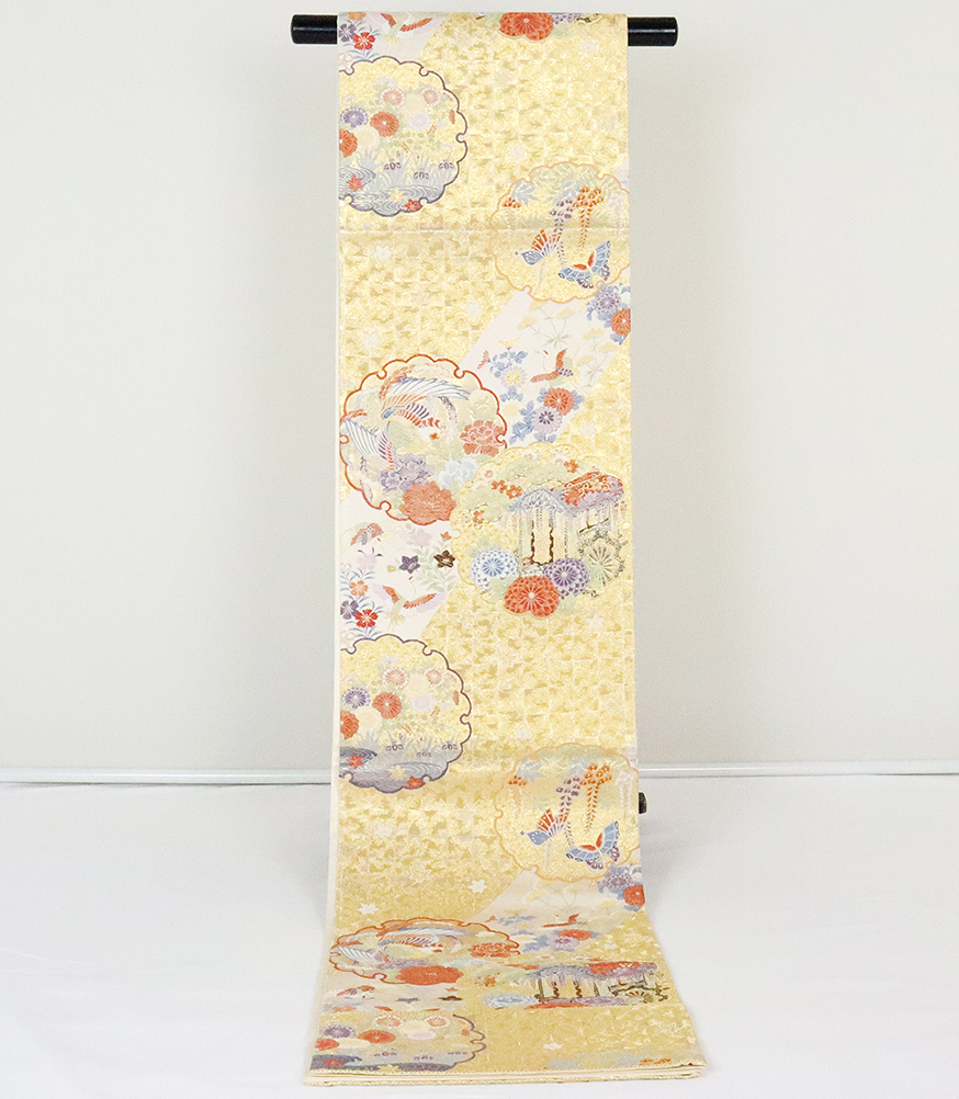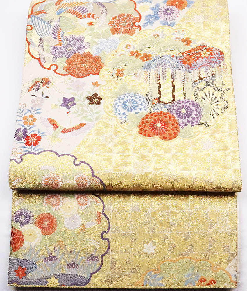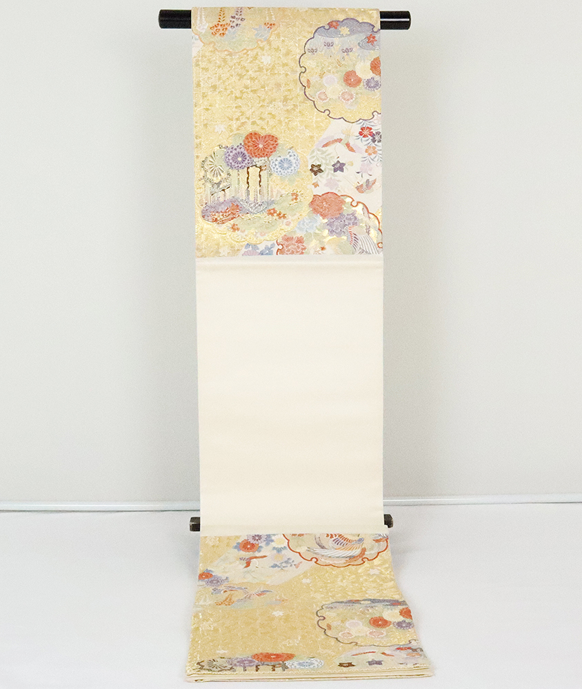 | 西陣織袋帯 本金箔 桃山雪輪文 菊・菖蒲・藤・蝶・鳳凰・牡丹・花喰鳥・御所車 未使用品 仕立て上がり | |