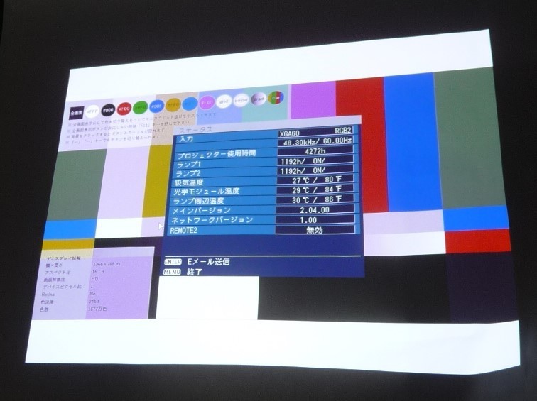 | Panasonic PT-D4000・4000lm 液晶プロジェクター ・メーカー:Panasonic ・型 番:PT-D4000 ・明るさ :4000ルーメン ・入力端子:D-Sub15など ・電源:100V仕様 ーーーーーーーーーーーーー ●ランプ使用時間:およそ1192時間 ーーーーーーーーーーーーー ●D-Sub15(PC接続)端子接続にて動作確認済みです。(その他の接続端子は未確認です。) ●写真だとカラーバーの色合いが変ですが、シャッターのタイミングによってさまざまな色になっています。目視では通常のカラーバーの色です。 ●詳しい仕様はメーカーサイトなどをご参照ください。 ◎付属品 本体、リモコン、説明書(コピー)、電源コード ●中古品です。外観使用感、キズ、落としきれない汚れなどあります。 ●本体の写真は在庫中の1台です。外観、使用感、筐体傷などどれも同程度です。 ※ランプは消耗品のため保障対象外です。 ※保証期間内であっても,水没・落下などお客様が原因で起こった不具合は保証対象外です。 ※ハードウェア、ソフトウェアに関するサポートは行っておりませんのであらかじめご了承下さい。 | |||||||||||||||||||||
