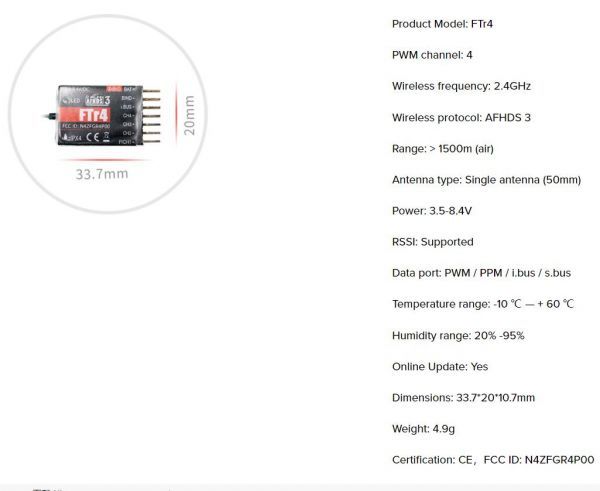 Flysky  FTr4受信機 AFHDS3 /PWM/PPM/i.BUS/S.BUS/4チャンネル/4.9g/3.5-4.8V/対応機種PL18 NB4