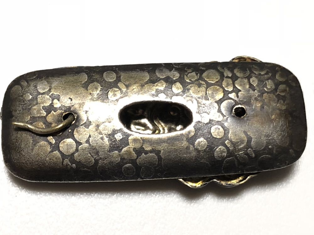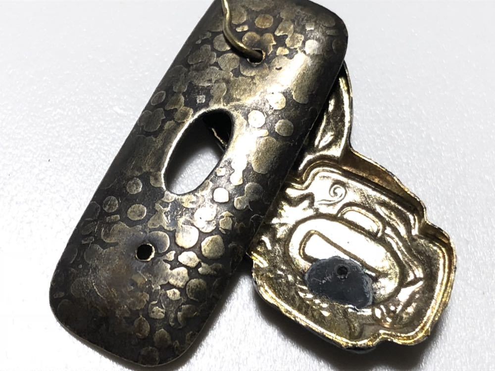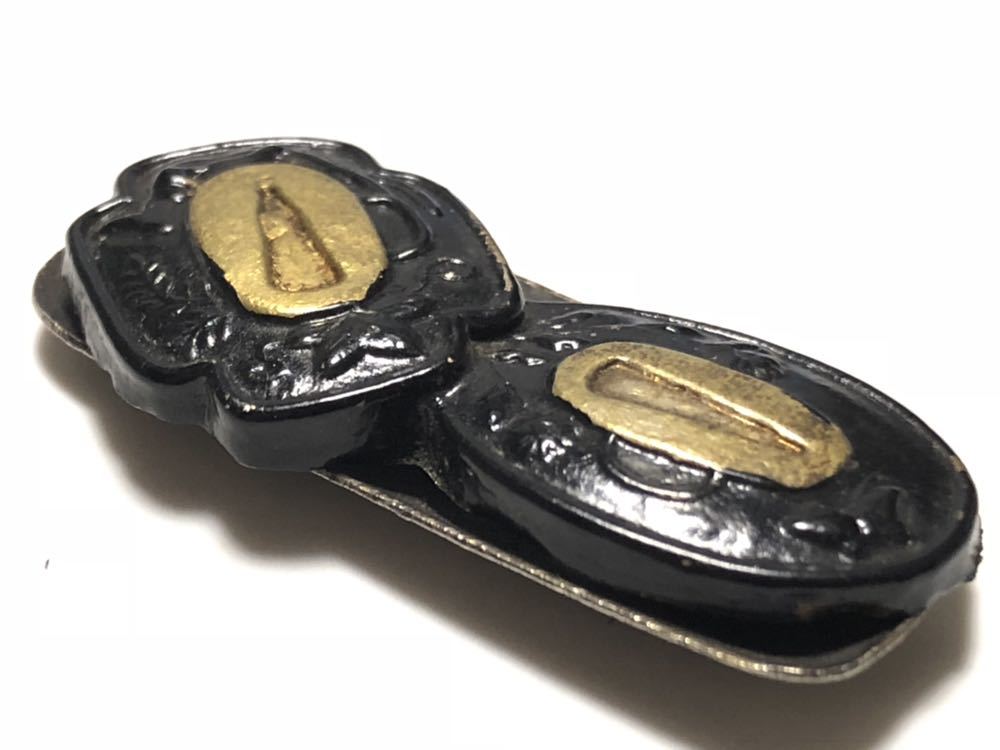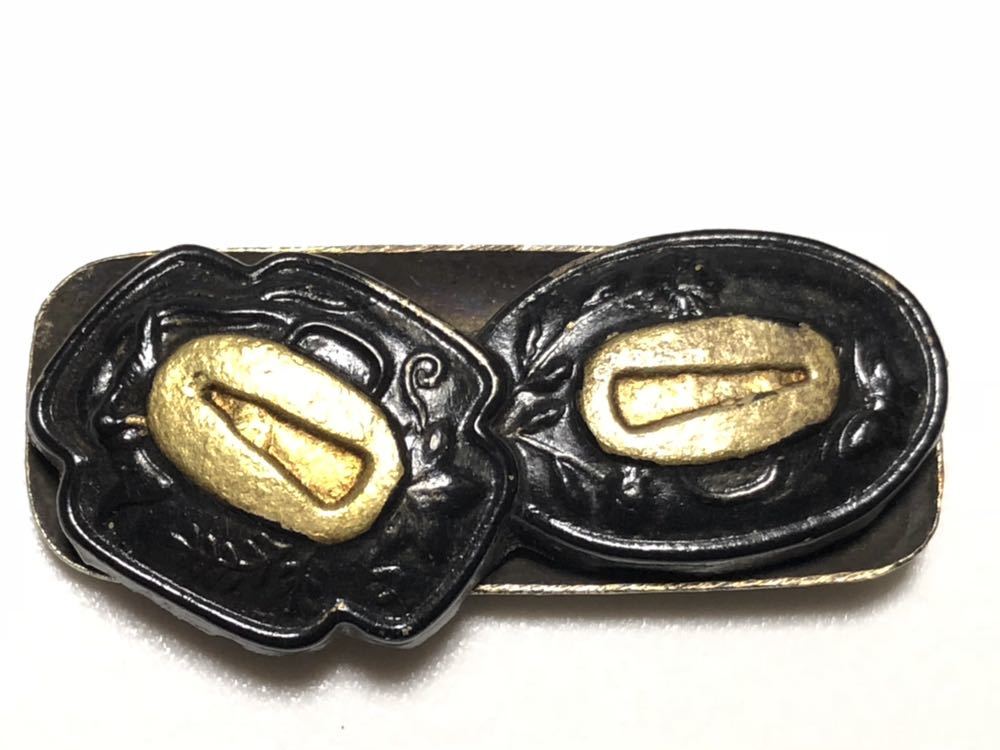 アンティークの彫金を施した、双鍔細工の煙草入れ金具です。留め金具が1本取れています。