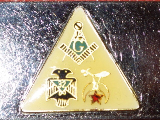 コンパスに直角定規にGのフリーメイソンのシンボルマークに32階位双頭鷲、シュラインのシンボルマークデザインの豪華でCOOLで珍しいタイプです♪