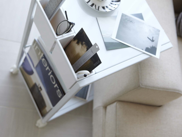 | 小物収納が付いたキャスター付きのサイドワゴンテーブル。 シンプルな作りですが機能が満載のこだわったデザインです。 リモコンや小物が収納できるボックス付いていますのでテーブル周りの小物がさっと片付きます。 キャスター付きで移動も楽に。雑誌や新聞などは側面のマガジンラック部分に収納できます。 |