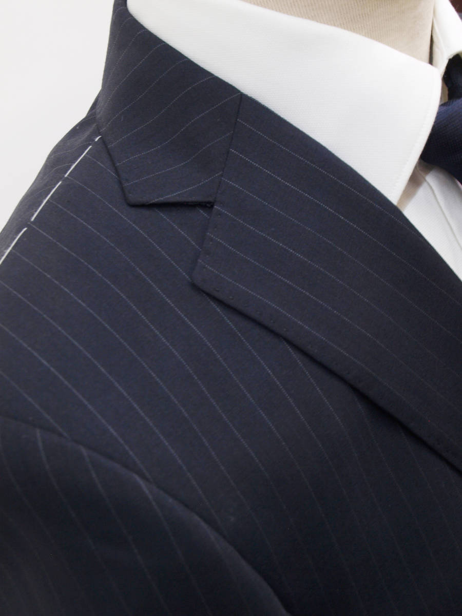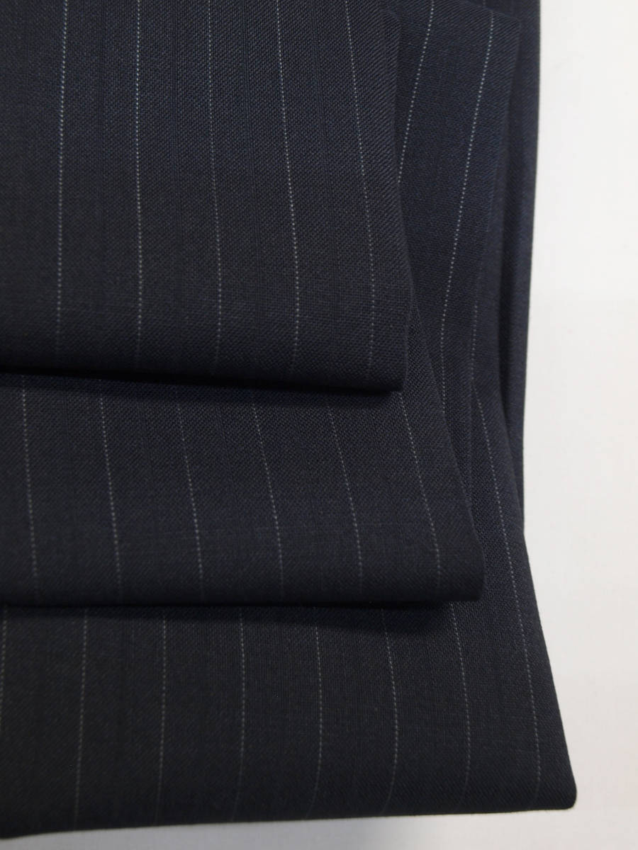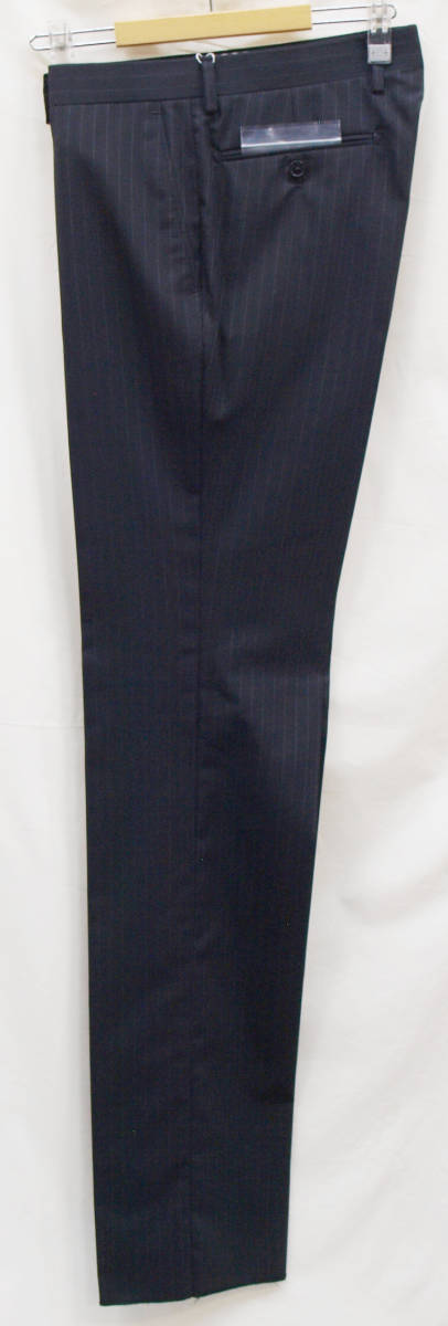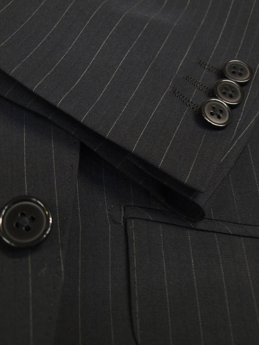 【サイズ】 Y6(YL YA6号サイズ相当) 目安の体型 身長170cm~180cm、ウエストサイズ78cm前後 【ジャケット実寸】 肩幅44cm 着丈73cm 袖丈62.5cm 脇下部分50cm 身幅45cm 【パンツ実寸】 ウエスト(胴回り実寸)78cm (平置きでかるくはかると78cmでひっぱってはかると81cmです。股上が浅いため実寸が2~3cmほど大きめに作られております。) わたり幅30.5cm 股下10cm下部分27.5cm 裾幅20.6cm 脇股上22cm 前股上24cm 股下93cm(裾上げしていない状態/新品) 【素材】 表地:ウール54% ポリエステル46% 裏地:胴裏/ポリエステル100% 袖裏/ポリエステル100% 【色】 黒色 【柄】 1cm間隔で薄グレーのラインがはいっており、そのラインとラインの中間には地と同黒の縦織がはいったストライプ柄 ・春夏向け紳士スーツ用、サマーウールブレンド素材を使用 【デザイン】 ・細いシルエット/スリムフィットタイプのビジネススーツ、新品、裾上げしていない状態です。 ・ジャケットはシングル2つボタンで、すっきりと着こなせるコンパクトなスリムスーツ ・パンツは股上が浅く、細くタイトなシルエットのノータックスリムパンツ 【縫製仕様】 ・ジャケットはシングル2つボタン、ノッチドラペル、襟縁等AMFステッチ入り、袖口ボタン3つ、センターベント、内ポケット3つ(小ポケット1つ含む)、背抜き(春夏物) ・パンツはノータック、膝裏当て付き、脇ポケット斜め付け、後ろポケット両玉縁で左のみボタン付き、フロントはファスナーでボタン&ホック仕様、うちかけボタン付き きちんとしたビジネス仕様の縫製仕立てで仕上がっております。 春先~夏~秋にかけて春夏メインのシーズン対応商品