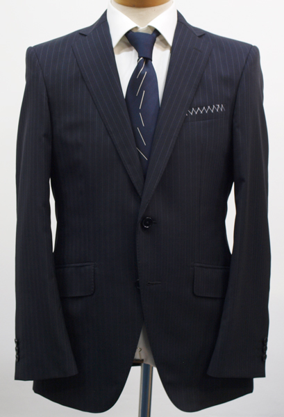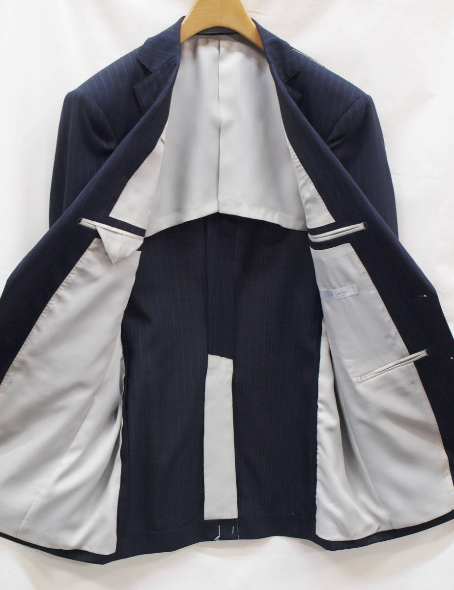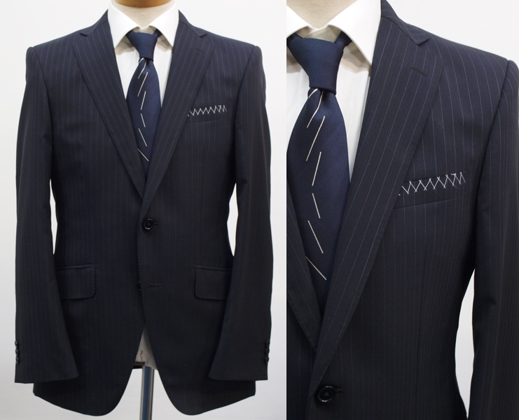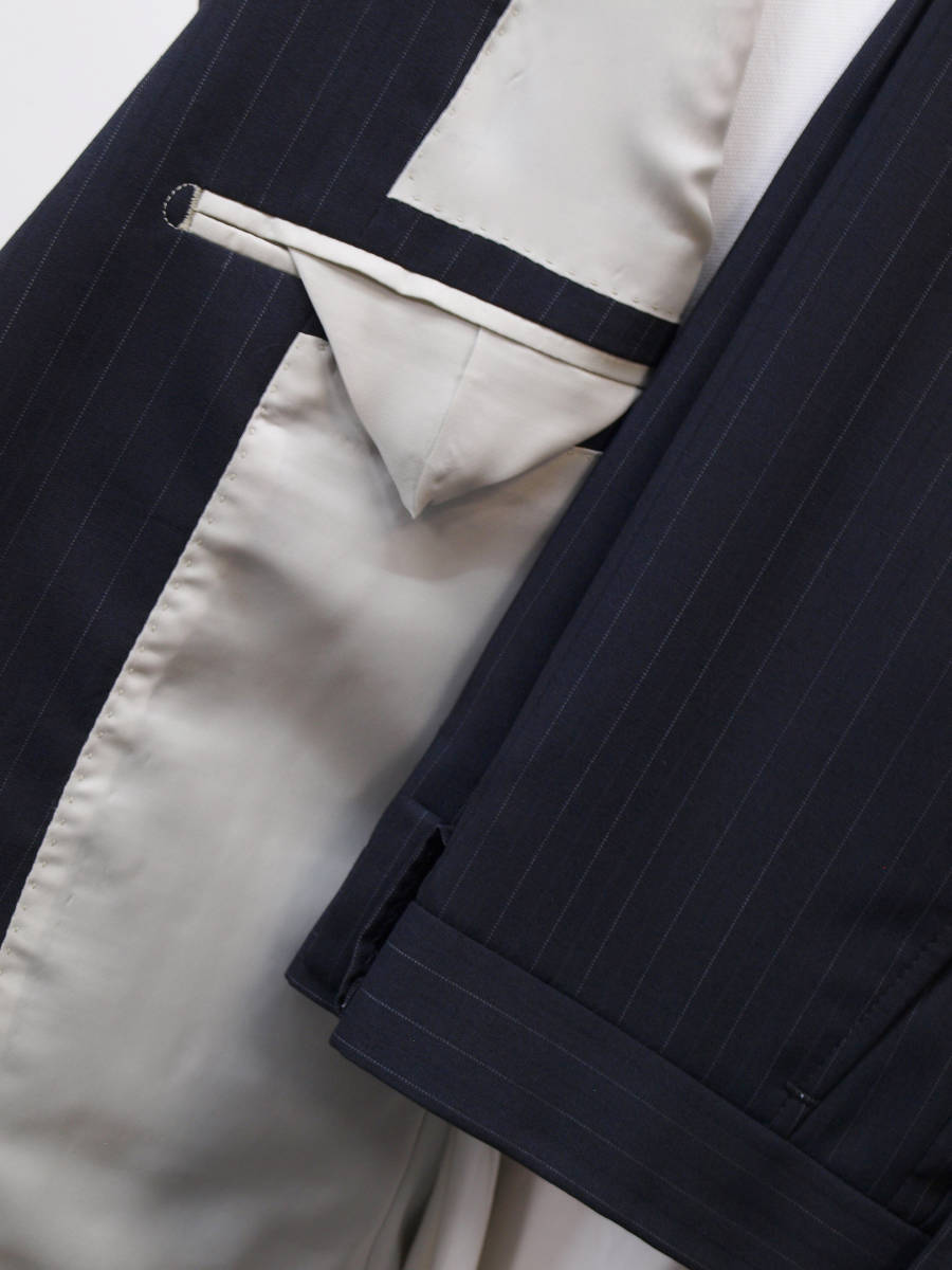 【サイズ】 Y6(YL YA6号サイズ相当) 目安の体型 身長170cm~180cm、ウエストサイズ78cm前後 【ジャケット実寸】 肩幅44cm 着丈73cm 袖丈62.5cm 脇下部分50cm 身幅45cm 【パンツ実寸】 ウエスト(胴回り実寸)78cm (平置きでかるくはかると78cmでひっぱってはかると81cmです。股上が浅いため実寸が2~3cmほど大きめに作られております。) わたり幅30.5cm 股下10cm下部分27.5cm 裾幅20.6cm 脇股上22cm 前股上24cm 股下93cm(裾上げしていない状態/新品) 【素材】 表地:ウール54% ポリエステル46% 裏地:胴裏/ポリエステル100% 袖裏/ポリエステル100% 【色】 黒色 【柄】 1cm間隔で薄グレーのラインがはいっており、そのラインとラインの中間には地と同黒の縦織がはいったストライプ柄 ・春夏向け紳士スーツ用、サマーウールブレンド素材を使用 【デザイン】 ・細いシルエット/スリムフィットタイプのビジネススーツ、新品、裾上げしていない状態です。 ・ジャケットはシングル2つボタンで、すっきりと着こなせるコンパクトなスリムスーツ ・パンツは股上が浅く、細くタイトなシルエットのノータックスリムパンツ 【縫製仕様】 ・ジャケットはシングル2つボタン、ノッチドラペル、襟縁等AMFステッチ入り、袖口ボタン3つ、センターベント、内ポケット3つ(小ポケット1つ含む)、背抜き(春夏物) ・パンツはノータック、膝裏当て付き、脇ポケット斜め付け、後ろポケット両玉縁で左のみボタン付き、フロントはファスナーでボタン&ホック仕様、うちかけボタン付き きちんとしたビジネス仕様の縫製仕立てで仕上がっております。 春先~夏~秋にかけて春夏メインのシーズン対応商品