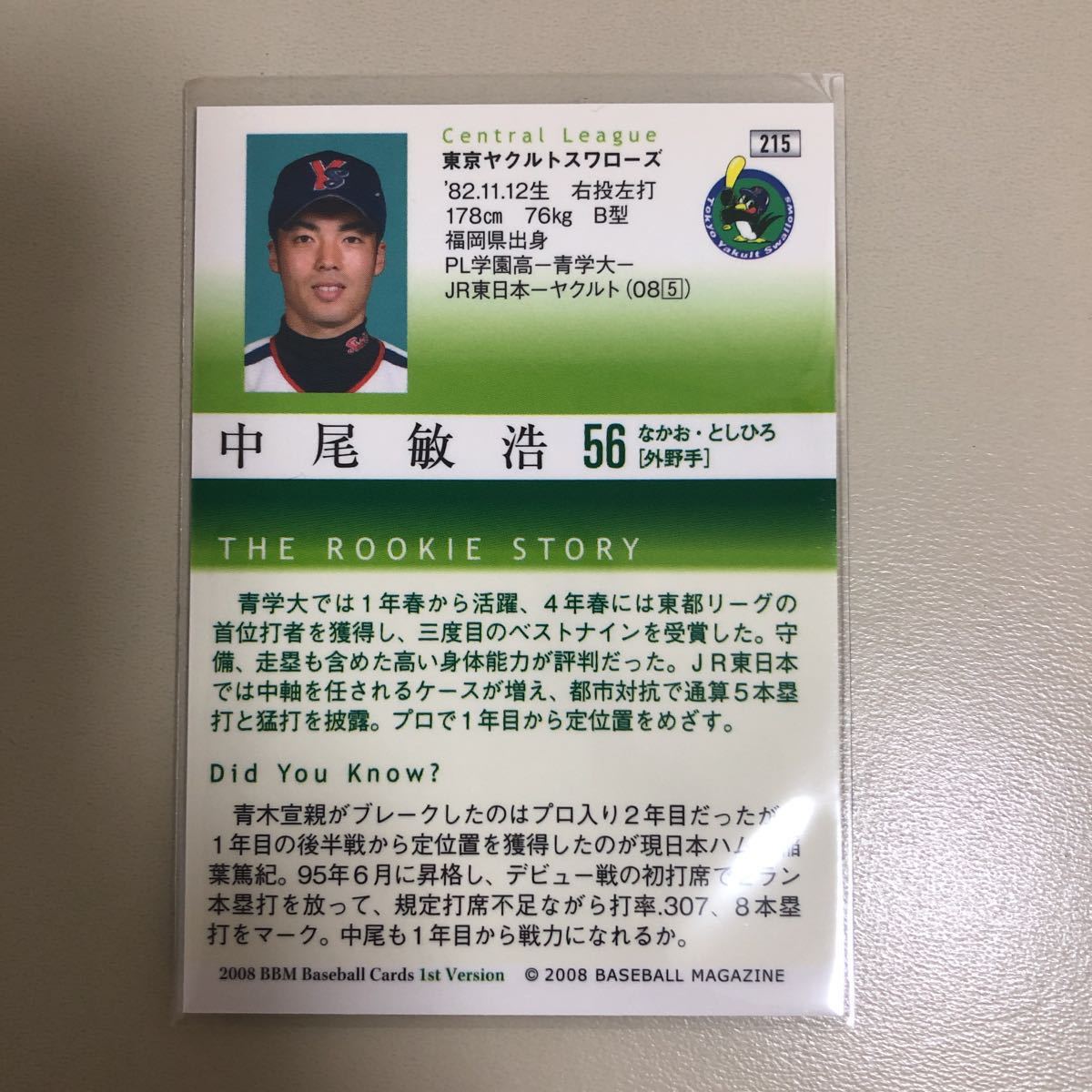 BBM 2008 1st 215 中尾敏浩 東京ヤクルトスワローズ ルーキーカード