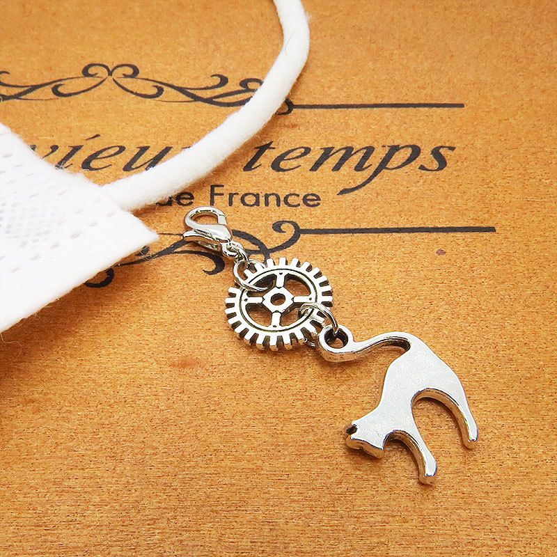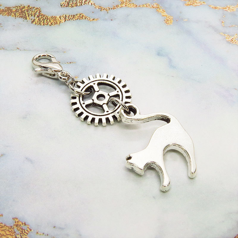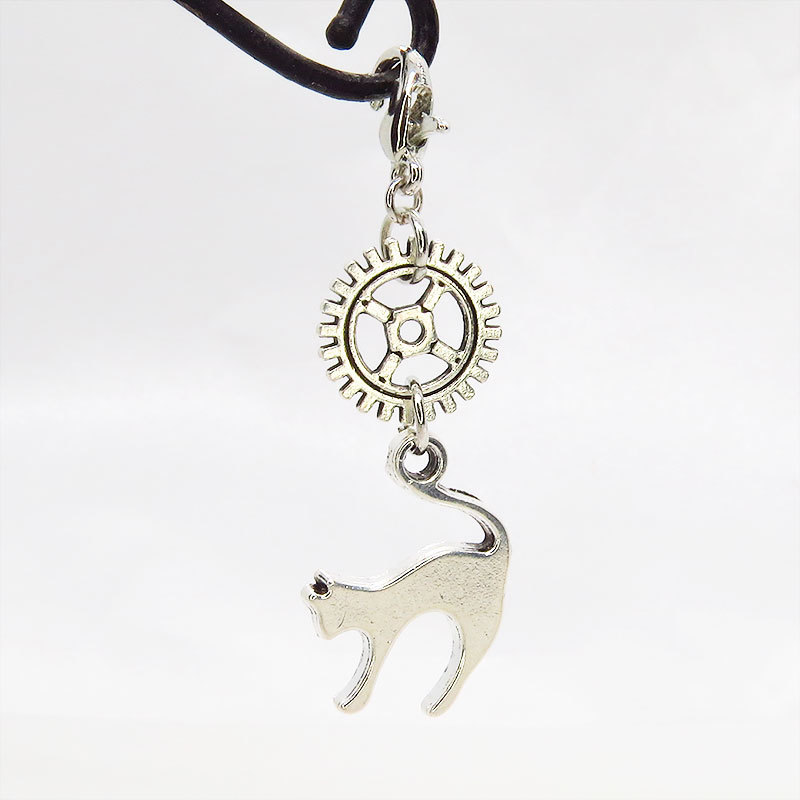 アンティークシルバーの跳ね猫に歯車のチャームを組み合わせたシンプルなスチームパンク風チャームです