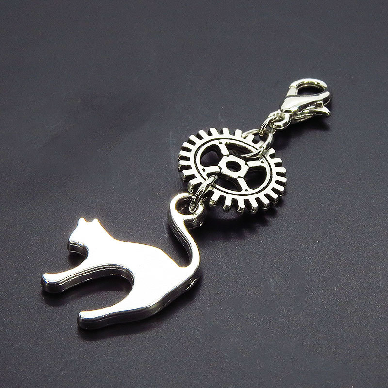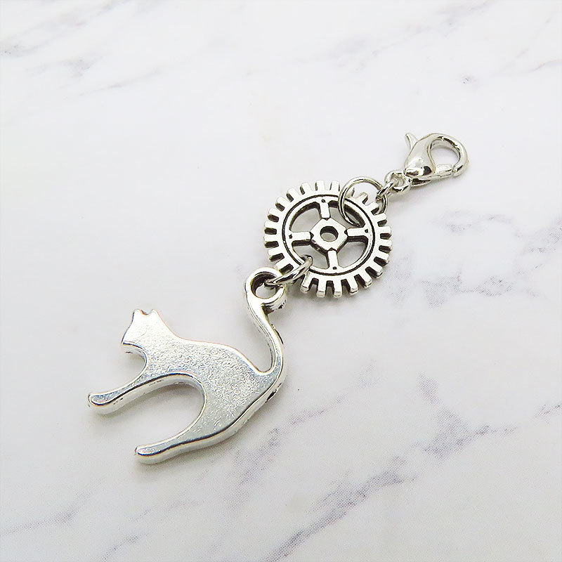 マスクチャーム チームパンク風 跳ね猫と歯車のシンプルなチャーム キーホルダー アンティークシルバーカラー
