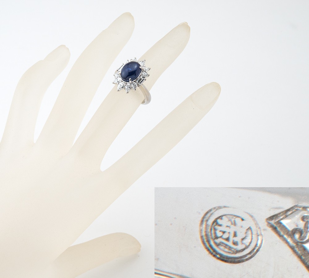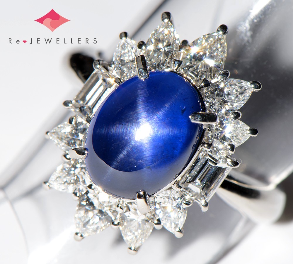 透明感のある深いブルーにミャンマー産特有の細やかで美しいシルクインクルージョンが描くシャープなスターは息を飲むほどの美しさ。形状の違うダイヤモンドによる取り巻きも豪華であり、高品質で稀少性の高いハイジュエリーです。
