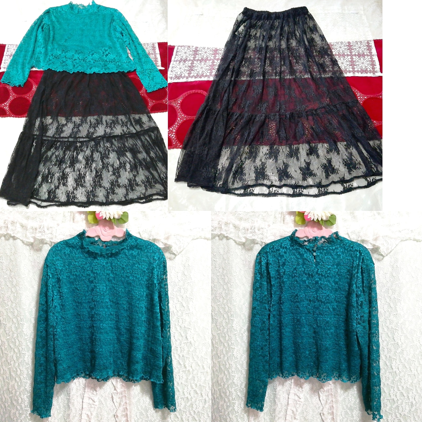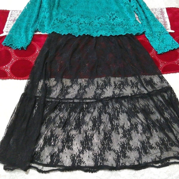 緑レースチュニック ネグリジェ ナイトウェア 黒シースルーレーススカート 2P Green lace tunic negligee black see-through lace skirt