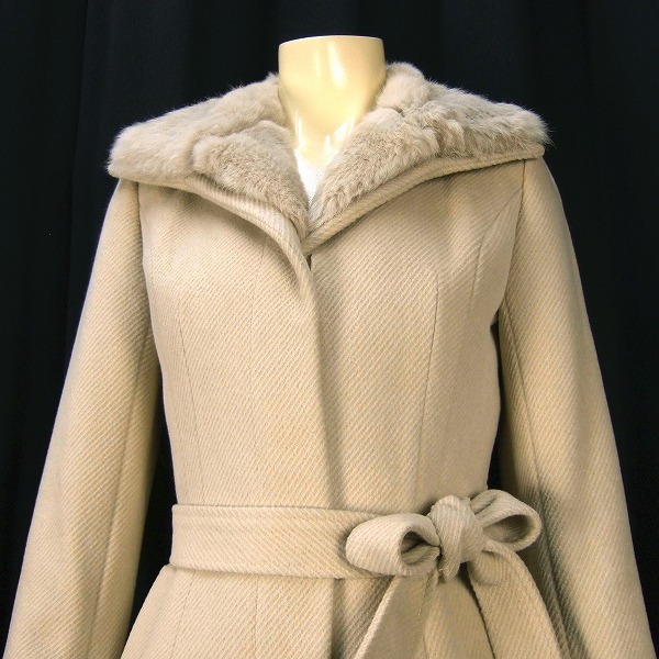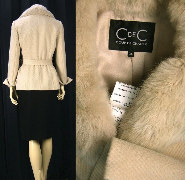 F 新品同様★CDEC COUP DE CHANCE クードシャンス★ベージュ系*優暖アンゴラ混*綺麗ストライプ柄*ラビットファー*上品コート*36(S*7号相当)