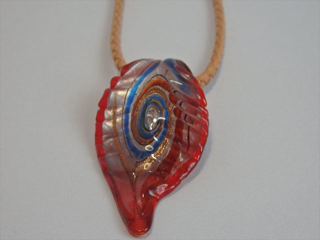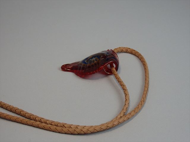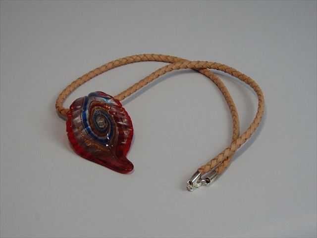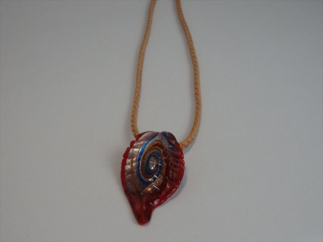 ガラス細工がとても綺麗なペンダントトップに牛革レザーチェーンのネックレスとのマッチングも素晴らしい。