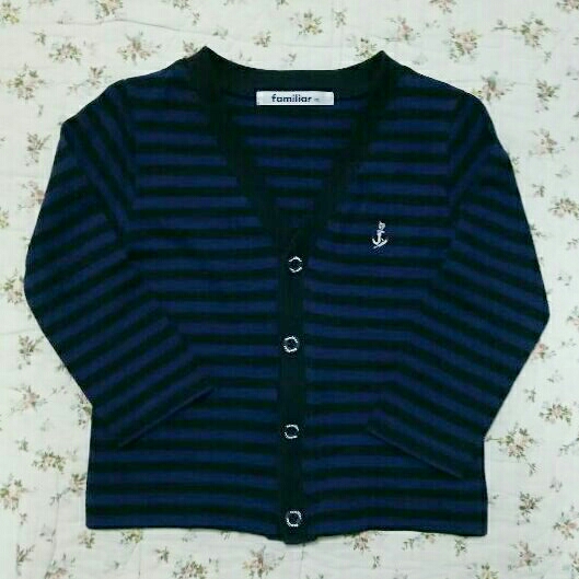ファミリアのカーディガンです。サイズは90。ロンTのような生地です。ブラック×ブルー美品ですが、子供の使用したものになりますので、自宅保管も含め気になる方のご入札はご遠慮願います。