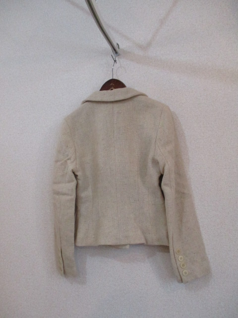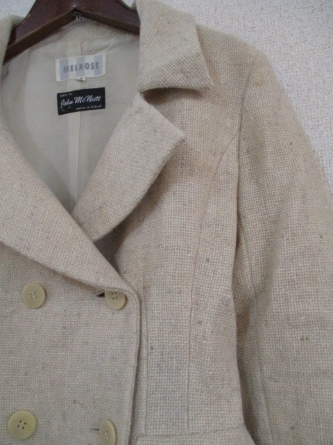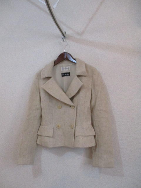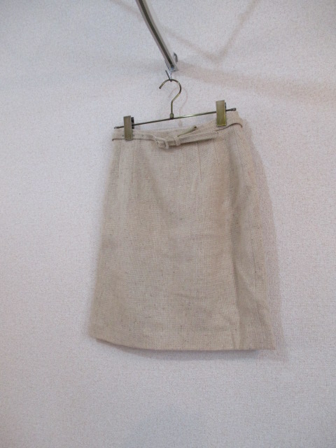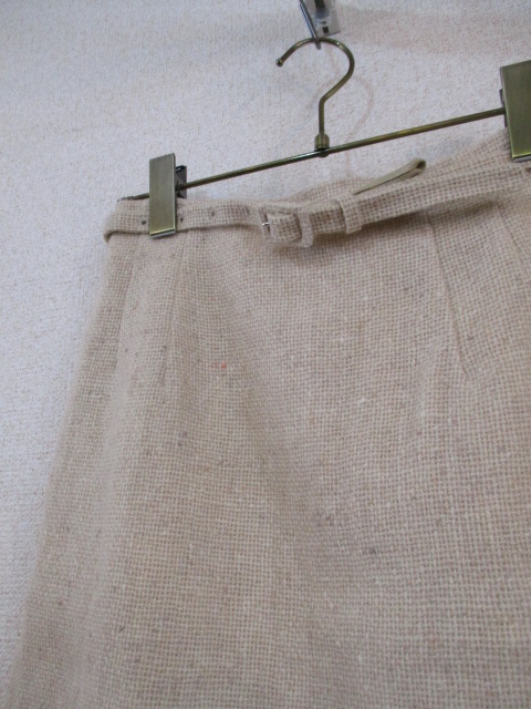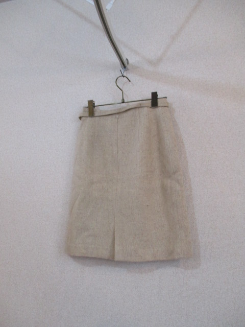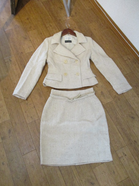 商品紹介 | きなりのスーツです。 ジャケットはダブルでウエストが切替えで少し細くなっています。 スカートはシンプルな膝丈タイトです。 ツイードのような素材で1色ではなく、いろいろな色が混ざっています。 生地はコートのような感じでやや厚手です。 《素材》 表地:毛100% 裏地:キュプラ100% |