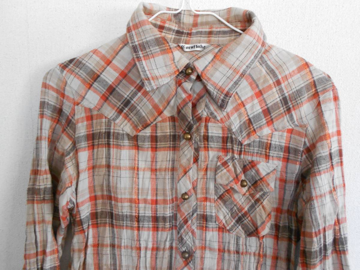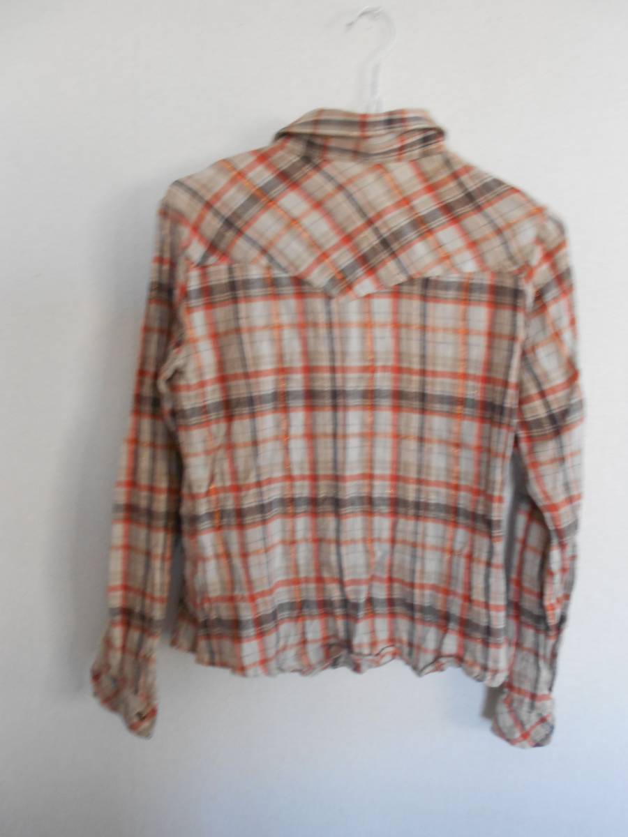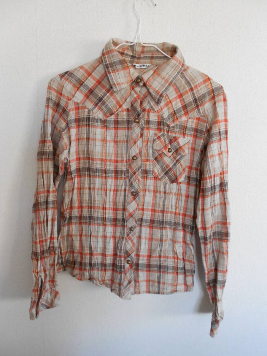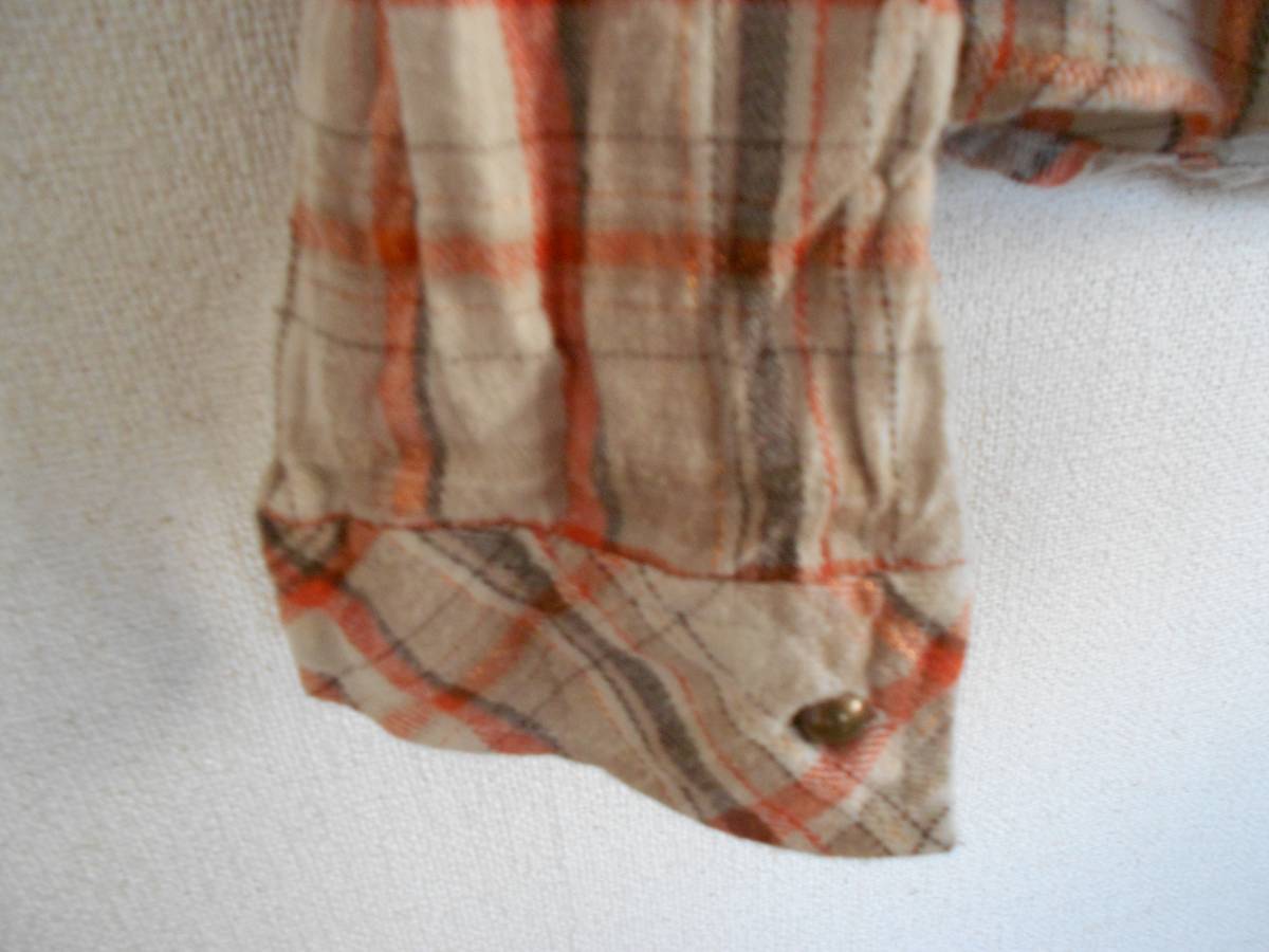 ほとんど使用していない茶系チェックのしわ加工(クリンクル加工・独特のプリーツが施されています)のシャツブラウスです。胸に蓋付き、金ボタン付き貼ポケット、前後に切り替えデザインあり、丸い金ボタン6個付いています。素材はスリット糸使用の綿100%です。バスト86~94、身長154~162、Lサイズです。着丈58、胸幅46、袖丈60位です。送料はクリックポスト185円です。