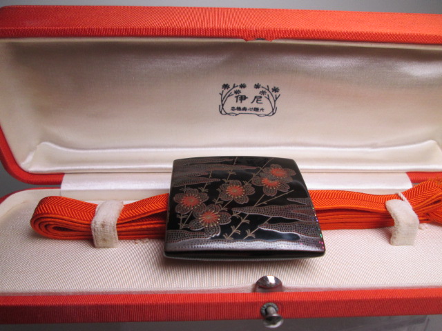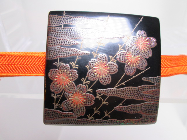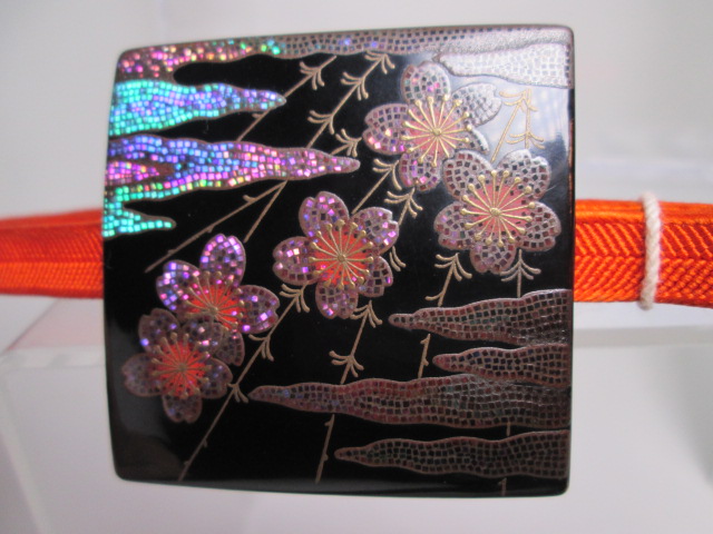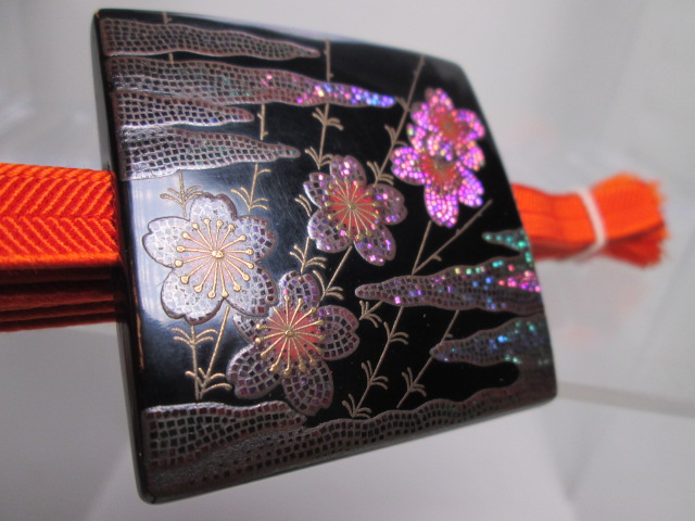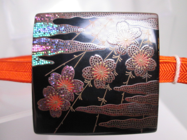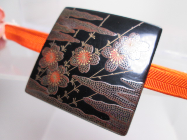 霞に桜の図と裏面には竹にきっ数の美しい銀蒔絵の帯留めです。状態はとても良く、虫食いは有りません。