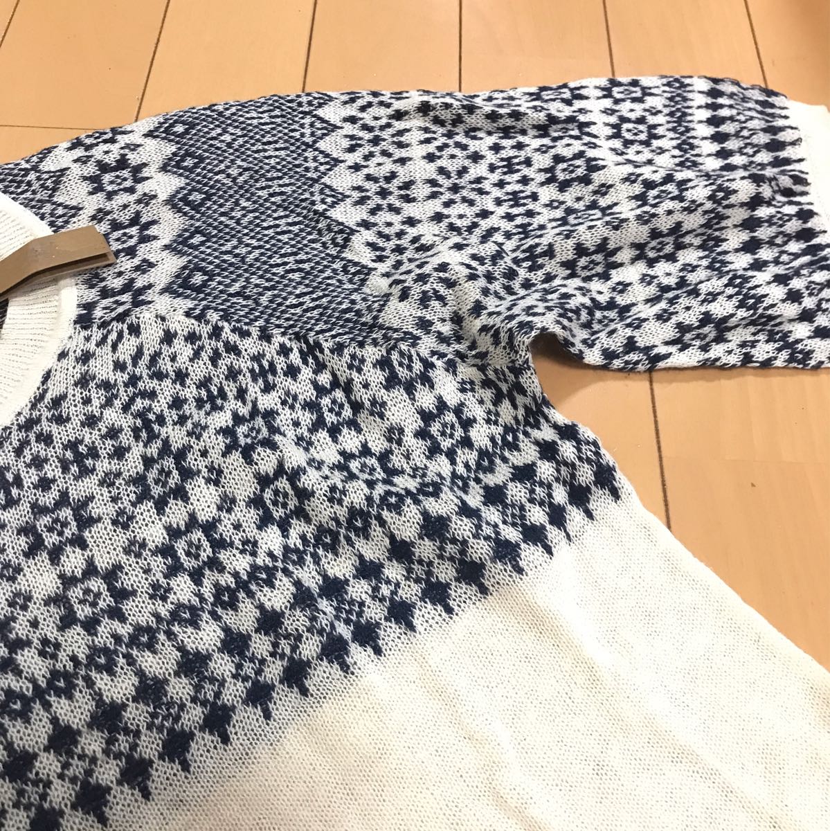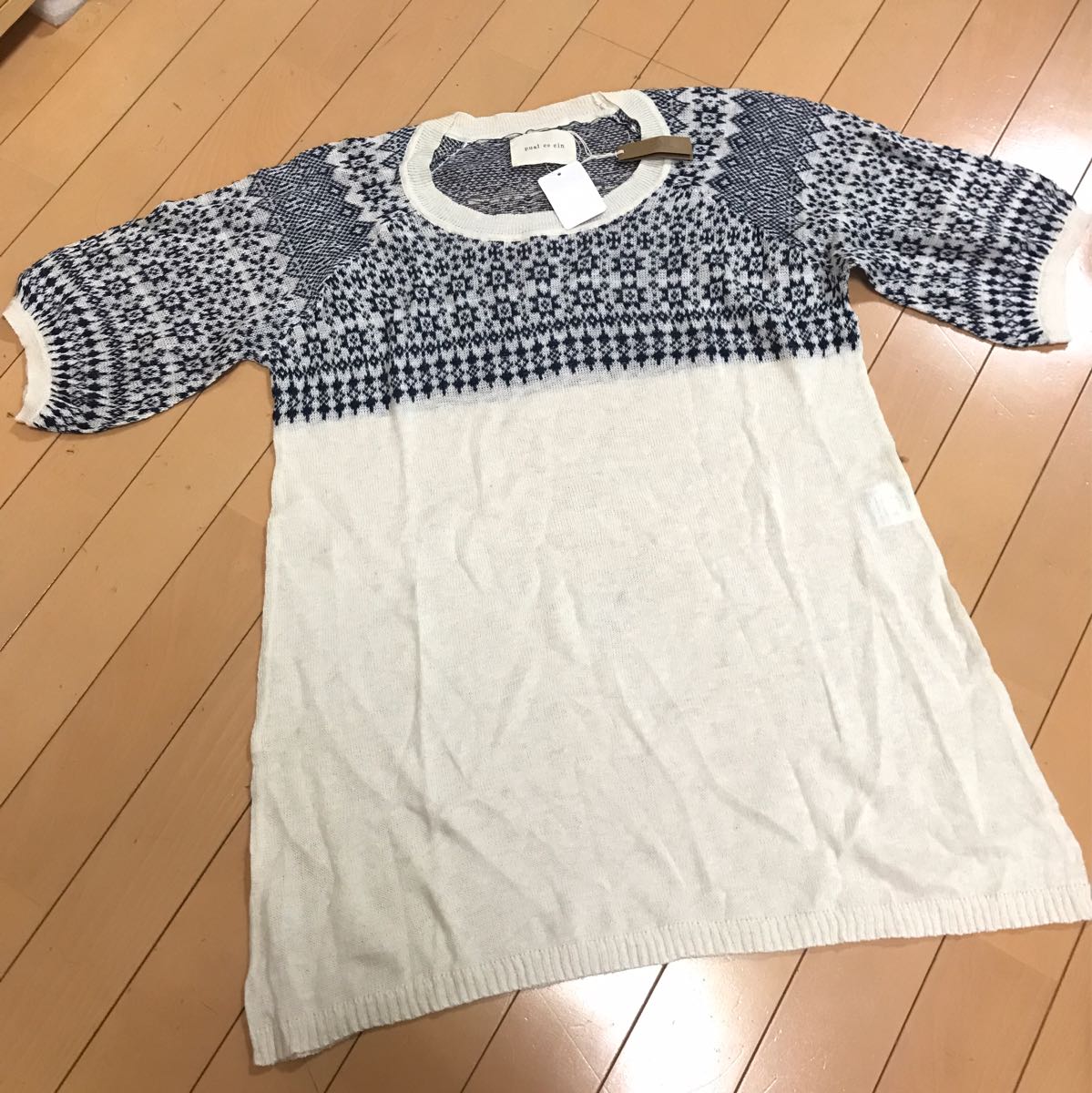 ◆麻混ニットチュニック♪プリントではなく編み込まれたネイビーの柄がナチュラル可愛い♪ラグランなので袖丈計測不可ですが七分袖くらいになります♪夏はインナーにキャミソールで、秋冬はタートルなどを入れるとオールシーズン着用可能