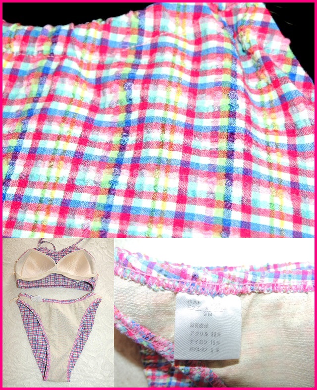 | =委託品= 中古品はクリーニング又はホームクリーニング済です。 新品・未使用品については現状のお渡しとなります。 保管の際のシワがございます。 ■■商 品 ラ ン ク■■ A0新品・未使用品です。 A1訳アリ新品・未使用品です。 B0未使用品に近い中古品です。 B1目立ったシミ・汚れ等が無い一般的な中古品です。 B2使用感(ヨレ)・毛羽立ち等あります。 B3薄め・小さめのシミ・汚れ・傷等があります。 B4目立ったシミ・汚れ・傷等があります。 B5ジャンク品です。 *注:感じ方には個人差がございます。 【レベル:B1】 目立ったシミ・汚れ等見当たりません。 ≪タグ表示≫ サイズ:9号/M バスト:83 ヒップ:87~95 ≪平置きサイズ≫ 多少の誤差はご容赦下さる様お願いします。 身幅:約27cm ウェスト:約27cm ヒップ:約31cm 着丈:約26cm スカート ウェスト:約28cm 着丈:約31cm ≪素材≫ アクリル80% ナイロン15% ポリウレタン5% ≪色・柄≫ ピンクチェック パッド取り外し不可 ≪お願いとご注意≫ ・新品・未使用品でも一度は人手に渡った物ですので完璧を求める方はご入札をご遠慮下さい。 ・お振込み手数料はご負担下さいます様お願いします。 ・仕事・家事の合間で作業をしておりますのでお急ぎの方のご入札をご遠慮下さい。 ・ご入金確認のタイミング(夜の確認)により発送が1~2日程遅れる場合がございます。 ・頂いた個人情報はお取引後すみやかに削除させて頂きます。 ・土日祭日の発送は郵便局都合によりお休みします。 ・フラッシュやPC環境により色が違う場合がございます。 ・喫煙者おりません。ペット(猫)がおります。 ・評価はご指示がない限り商品受け取り完了のお知らせ後にさせて頂いております。 ≪不要の方はお手数おかけしますがメッセージをお願いします。≫ | |||