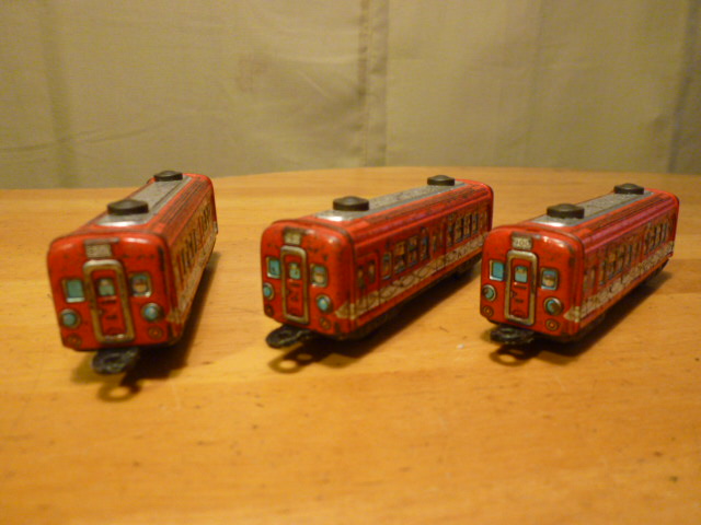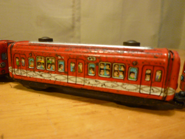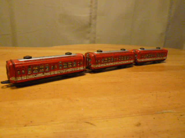 こちらは少し古いブリキ製の3両編成の急行電車の様です。1両には自在車?の様に押して離すと回転音を残しながら少し進む機能が付いていて、同型の車両には運転席上部中央に「900」の数字があり、どちらも満員で窓にはそのお客さんの表情が細かく見え、サイドドァ付近に「急行」の文字と「200」の数字もあります。