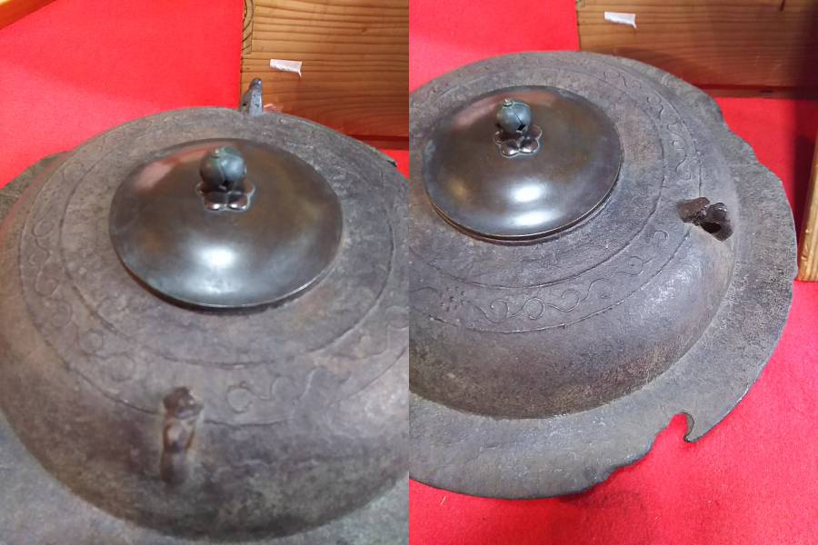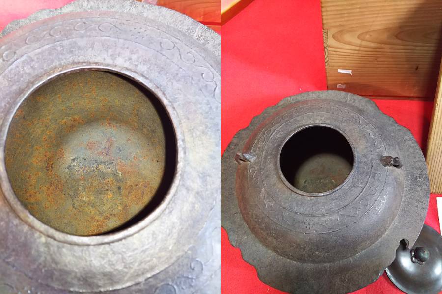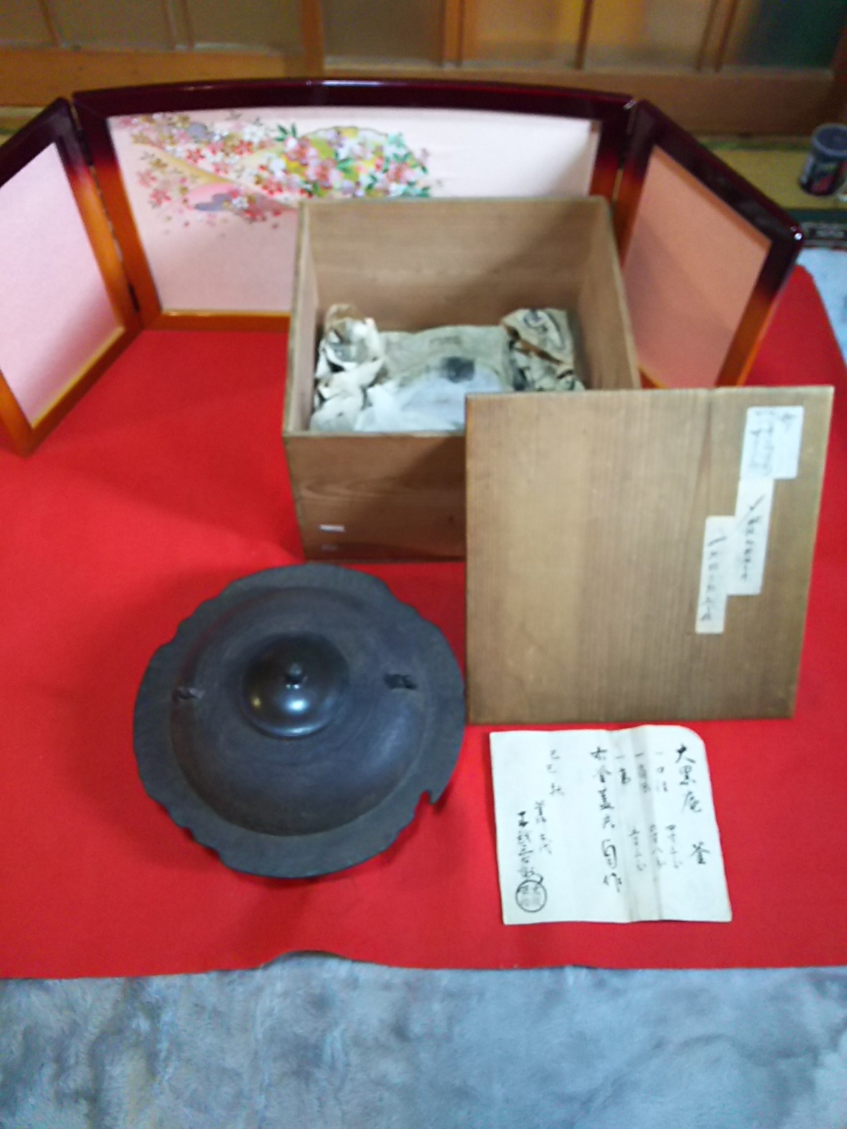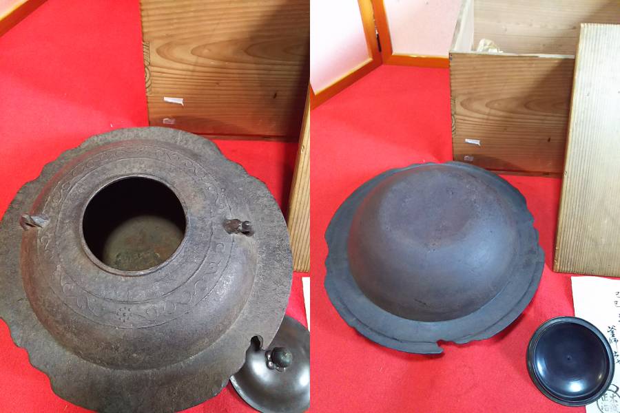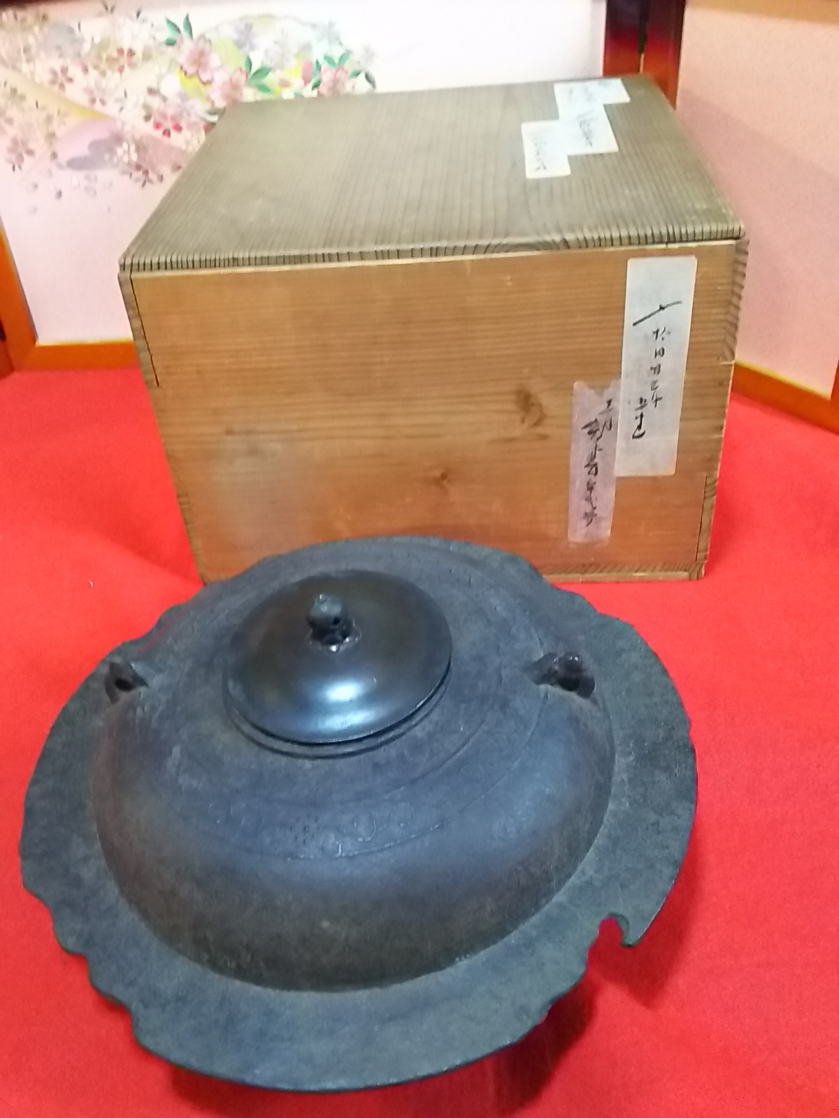 (鳥羽庵)うぶだし骨董茶道具釜師六代木越三衛門政治茶釜 サイズ径約33,5センチ 高さ約14センチ 時代共箱付(極め書き付) 商品状態とても珍しい形の釜です。48時間水を張りましたが漏れは、ございませんでした。 詳しくは、写真参照でお願いしまますます下にフォトアップ写真ついてますので参照お願いします。 骨董品につきノンクレームノンリターンでお願いします。 発送は、ゆうパック140サイズにて発送いたします。 落札後48時間以内で連絡できる方4日以内で入金できる方入札待ってます。